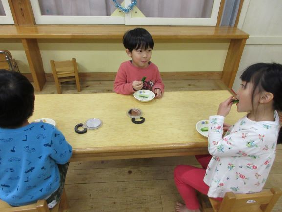 まず、調理担当者から、よく噛むとどんな効果があるのかなど、話をしました。子ども達は、真剣に話を聞きながら歯の大切さを学びました。実際に、胡瓜を細かく切った物、大きく切った物を用意し、胡瓜から出ている水分がどのように違いがあるのかも、見たり触ったりしました。