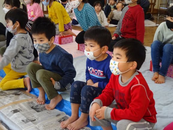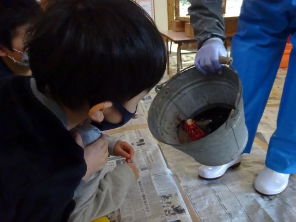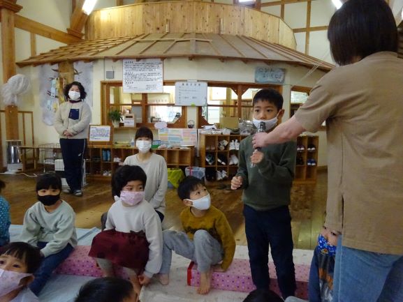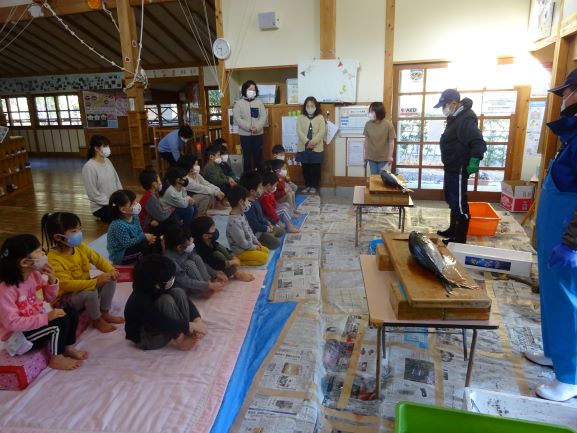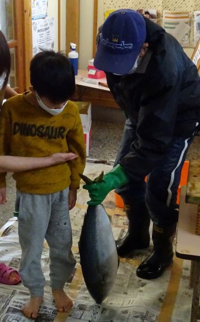 JFしまねさんからブリを2匹寄贈していただき、今年もブリの解体を行いました。地域講師の福島達さんと、速人さん親子に来て頂きさばいてもらいました。子どもたちはとても楽しみにしていて、「今日はブリの大会だが!」と思わず言い間違えてしまう子もいました。地域講師さんの巧みな包丁さばきで、大きなブリがみるみるうちに姿を変え、頭と骨だけになると「わぁ、すごい!」と驚きの声があがりました。解体後の質問コーナーでは、「ブリは小さい時はどんな名前ですか?」「どうしてそんなに上手にさばけるんですか?」等の質問があり、一つ一つ丁寧に答えて頂きました。中でも、「ブリをさばくことは、最初からできたわけではないけど、何度も練習して自信が持てるほど上手になりました。みんなも、やりたいと思った事は何度も挑戦すれば上手になれるから、たくさんの経験をしてください」と話してくださった言葉が子どもたちはもちろん、私達職員の心にも深く刺さりました。