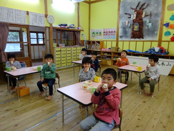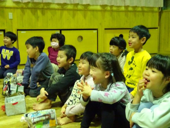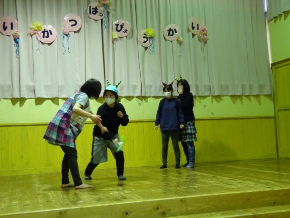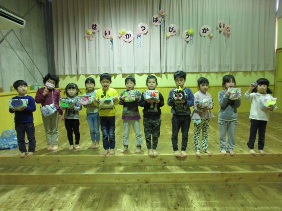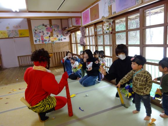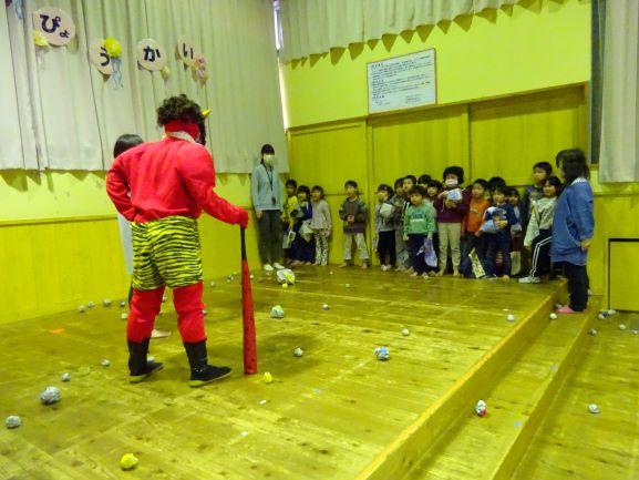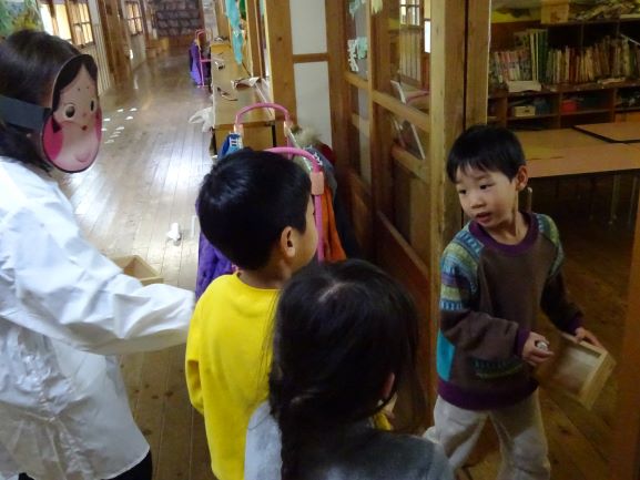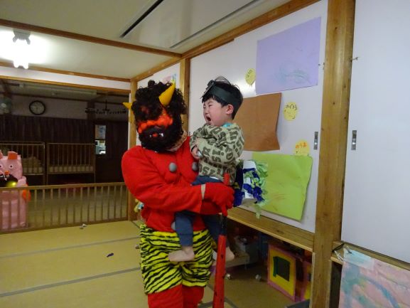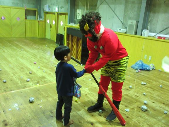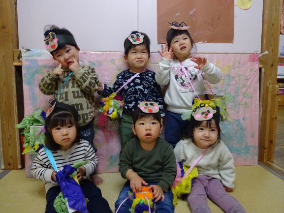 節分に合わせて豆まき会をしました。職員劇では、節分の由来を聞いたり、心に住んでいる「やだやだ鬼」「泣き虫鬼」「一番じゃなきゃいやだ鬼」が出て来て、子どもたちは自分にもそんな鬼がいるかも、と苦笑いしたりしながら見ていました。