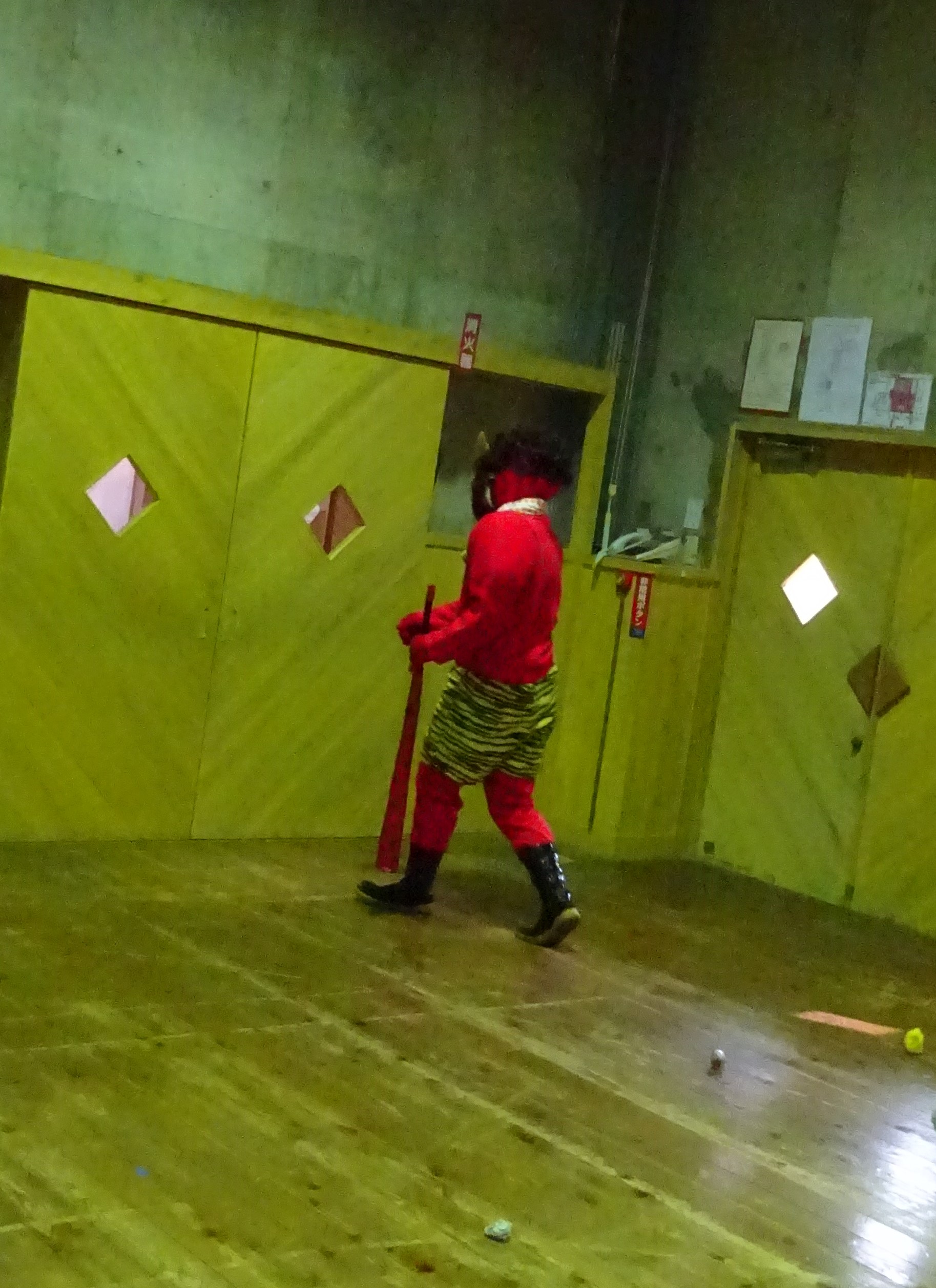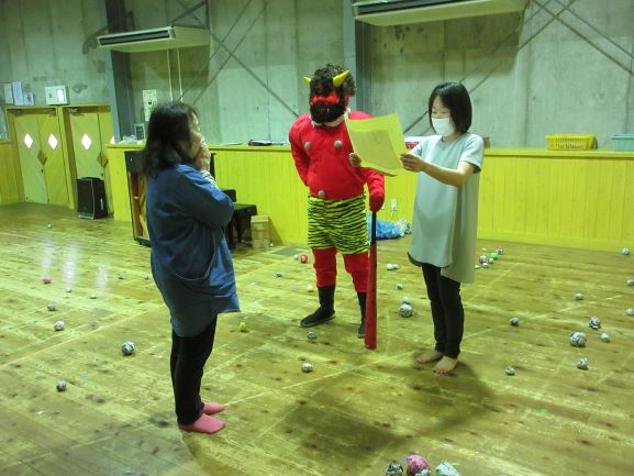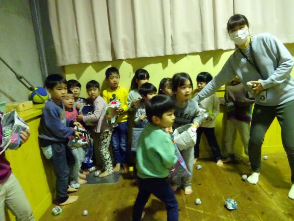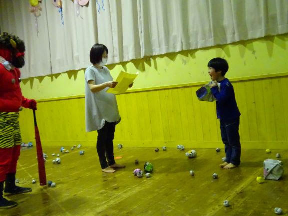 福の神様とにじ組の代表が保育所の中に新聞紙で作った豆をまいている間も、どこから鬼がやって来るかとソワソワ落ち着かない様子でした。「僕が鬼をやっつける!」「先生を守ってあげる」と勇ましかった子どもも、太鼓の音と共に鬼が登場すると、「たすけてください」と職員の陰に隠れてしまいました。マスクを忘れて声が出せない鬼は、代わりに手紙を書いてきていて、職員が代読しました。みんな真剣に聞き、背筋をピンと伸ばして返事をしていました。最後は所長先生が呼ばれ、「コロナウイルスで大変だと思うが、子ども達の為に頑張ってくれ」と激励をして帰っていきました。怖がりながらも大きな声で「おにはそとー」「ふくはうちー」と新聞紙の豆を力いっぱい投げたので、心の中の鬼も逃げて行ったことと思います。