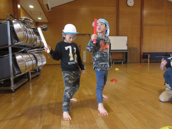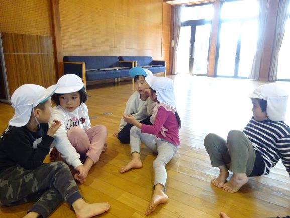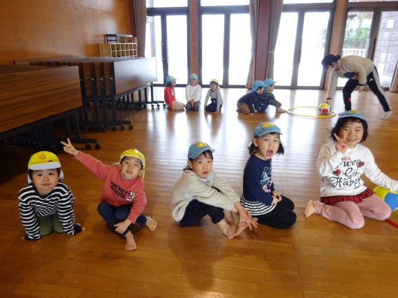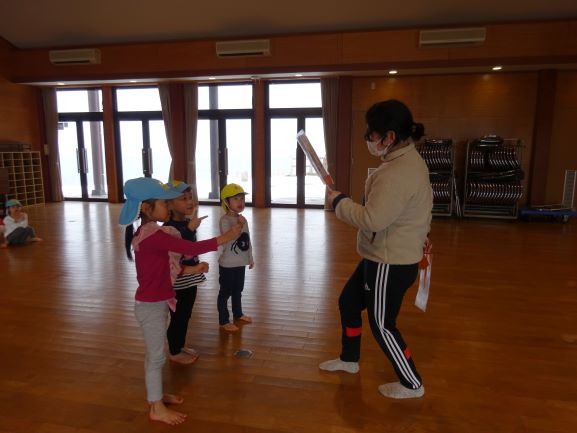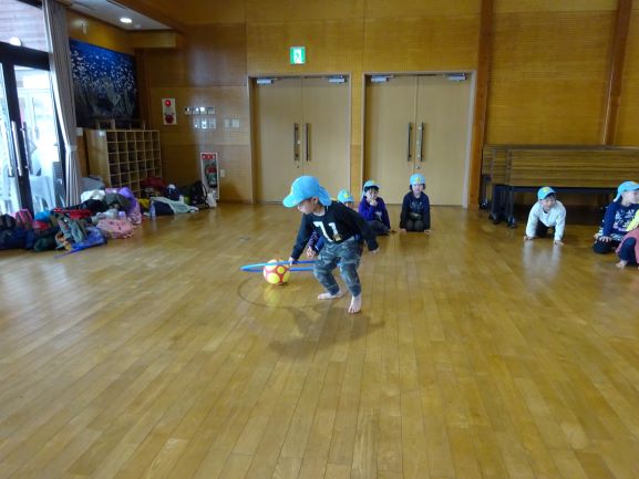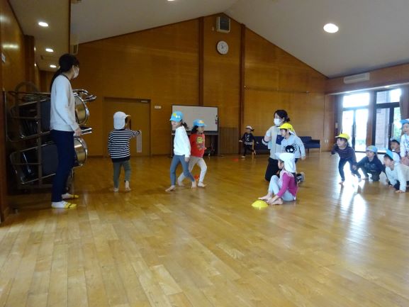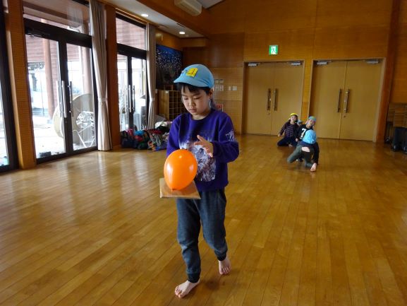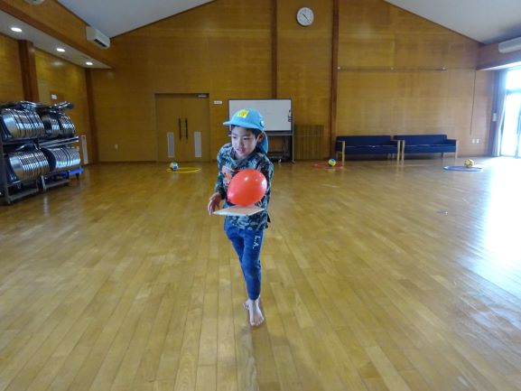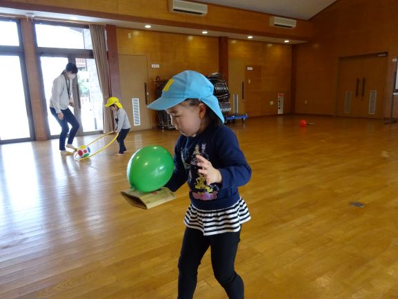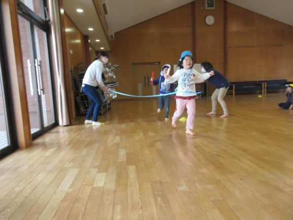 マリンパークでは、多目的ホールでミニ運動会を行いました。4,5歳児の混合のチームを組んで、競技に参加しました。ボール運び競争、ジャンケン競争、リレーとみんなで色々な競技を楽しみましたよ。思う存分体を動かして大満足だったようです。