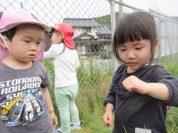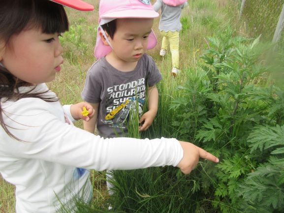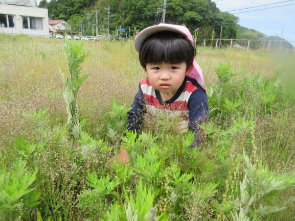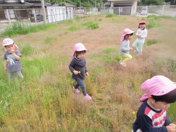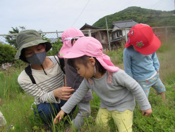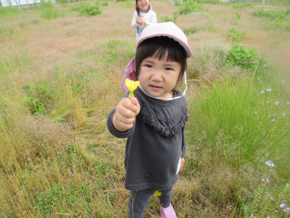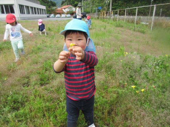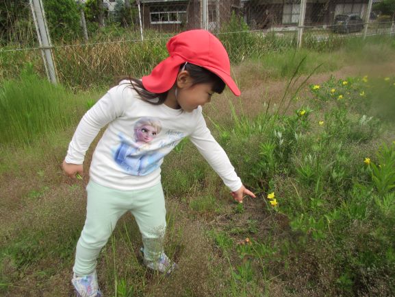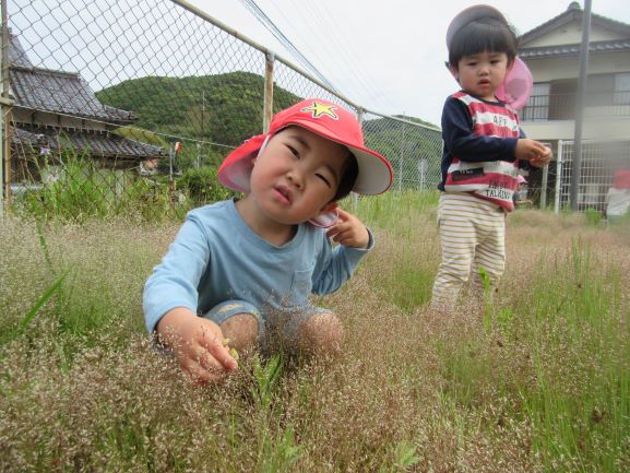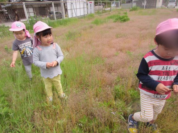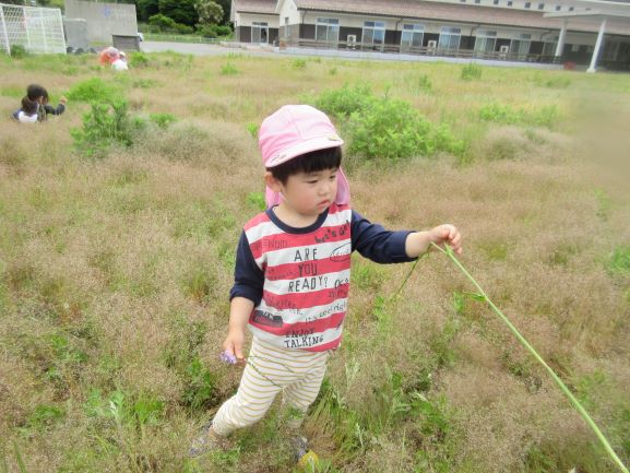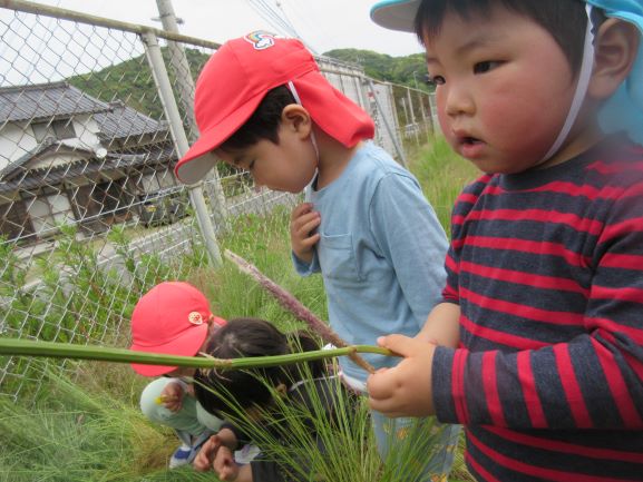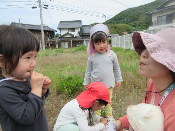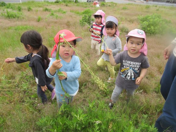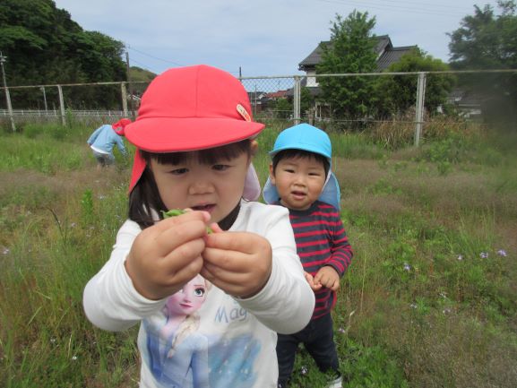 途中でカラスノエンドウを見つけて担任が笛を吹くと「したいしたい!」と子ども達も挑戦!まだ難しく、なかなか吹くことはできませんでしたが、一生懸命吹く姿が何とも言えず可愛らしかったです。