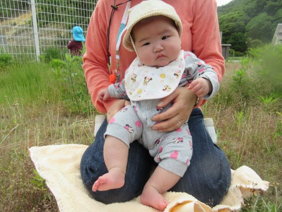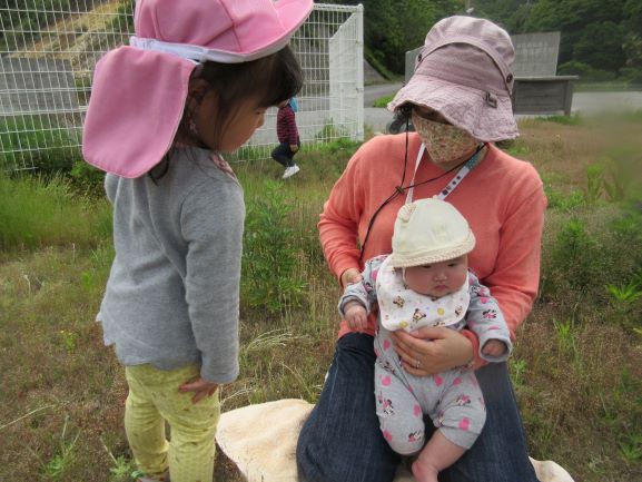 芝生に着くと「おはながたくさん!」、「むしがおるかなぁ?」と大喜びで遊び始めた子ども達です。お花を摘んだり、バッタやてんとう虫を見つけたりしてたくさん自然にふれて遊ぶことができました。
