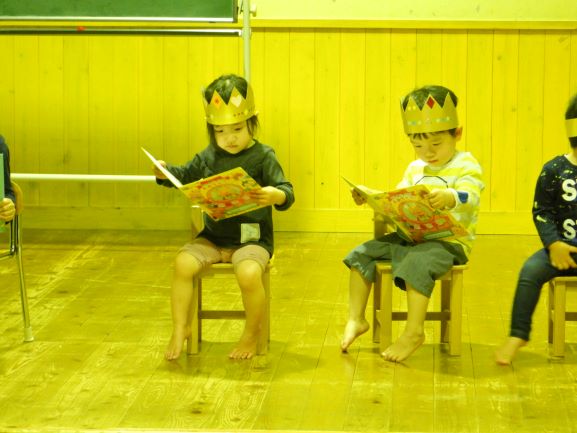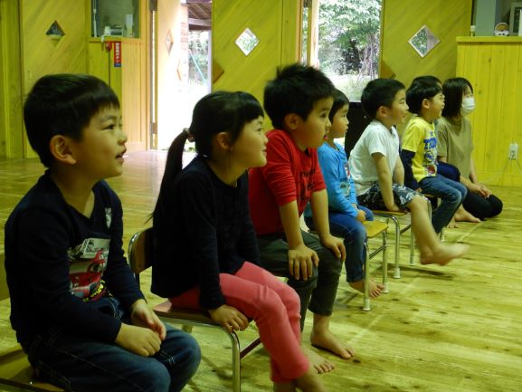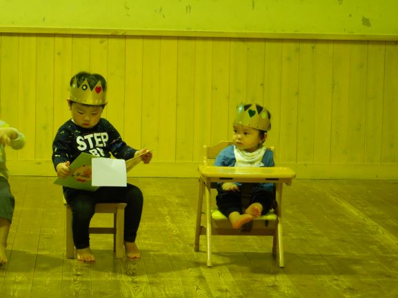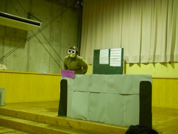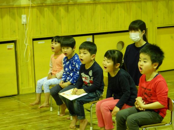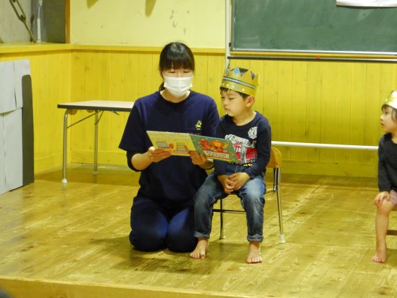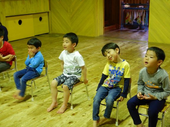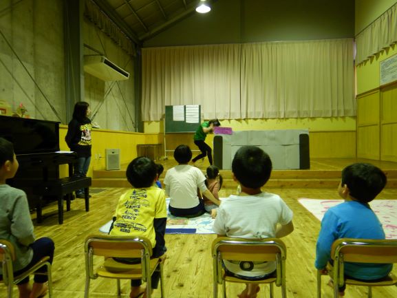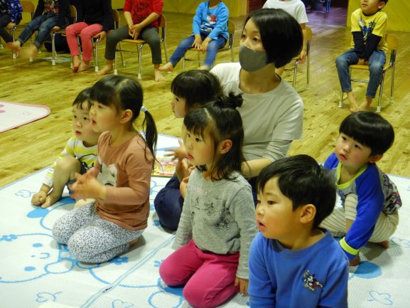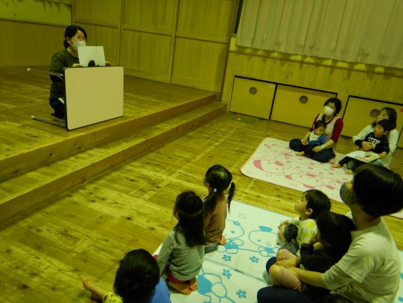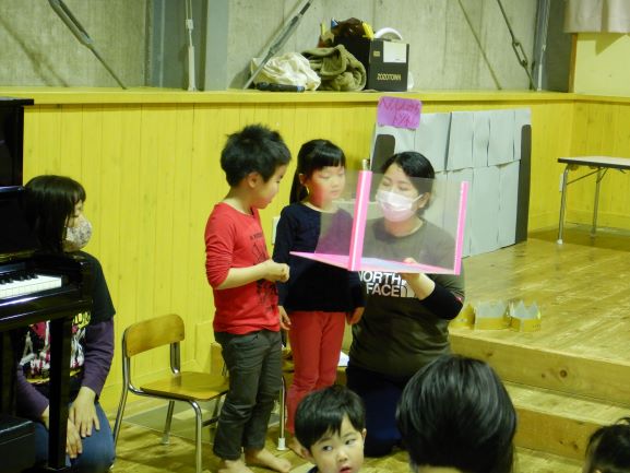 お楽しみ会では、「私は誰でしょう?」というクイズをしたり、「変身トンネル」の劇を観たりしました。変身トンネルでは、時計が毛糸に変身したり、カッパがパッカパッカと馬に変身したりと色々なものが登場しました。子ども達にとって楽しい会になったようで何よりでした。
