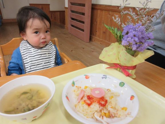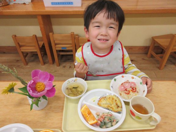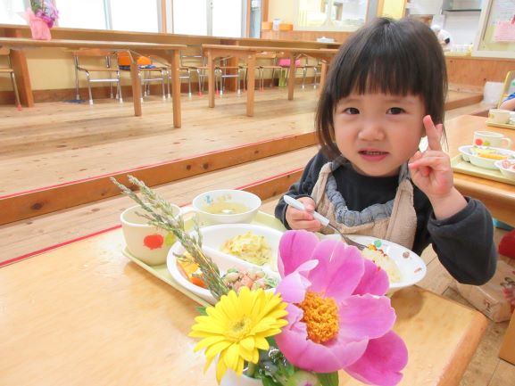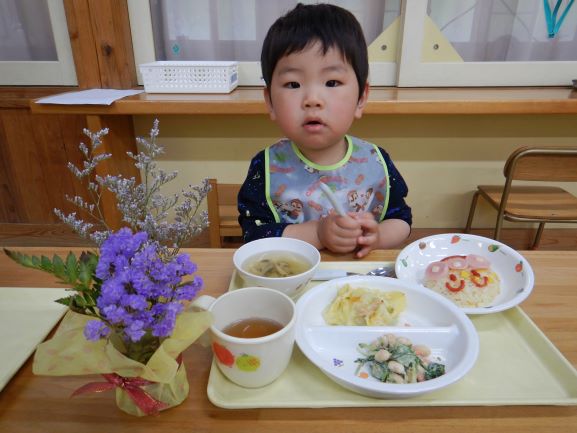 おいしい給食に大喜びでした。2才になりました