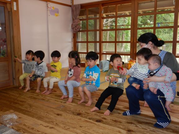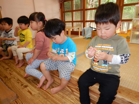 給食室の先生に協力してもらい、野菜のへたと茎を使ってスタンプ遊びをしました。何の野菜かどうかのクイズをすると、「パプリカ!」「ピーマン!」とすぐに答える子どももいましたよ。遊びを通じて興味をもち、苦手な野菜も少しずつでも食べられるようになるといいなと思っています。
