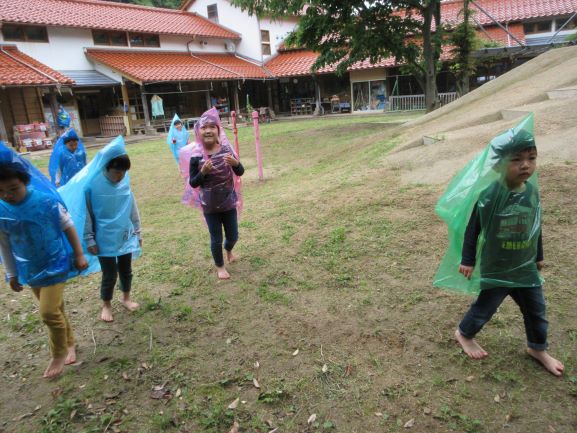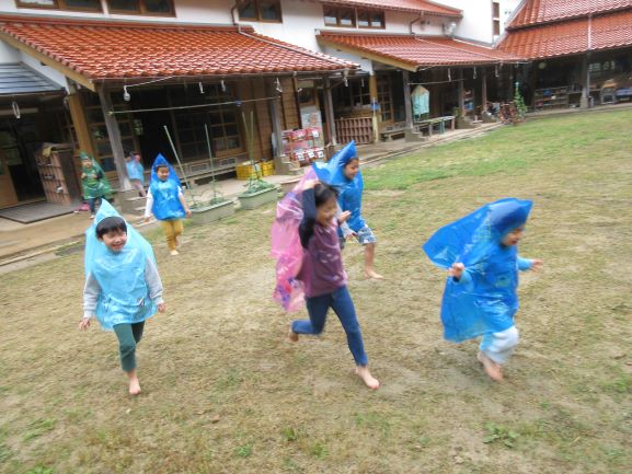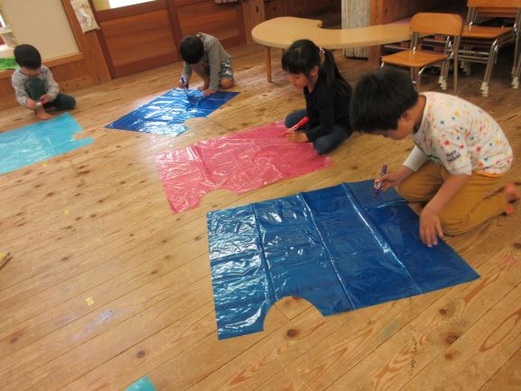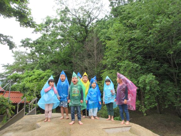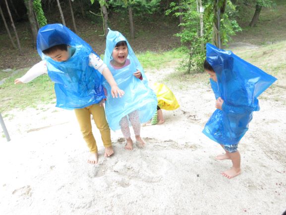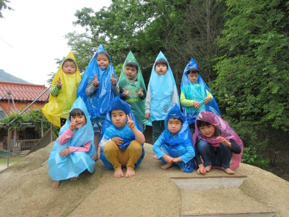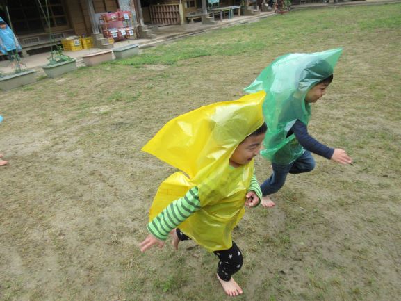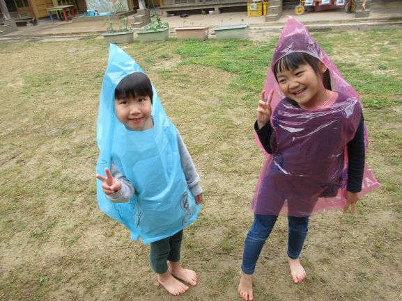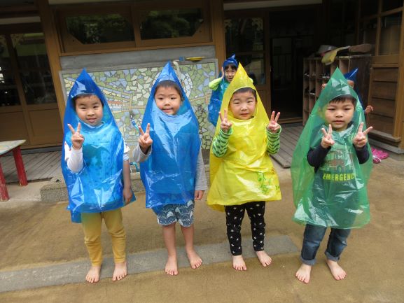 雨が多い梅雨も外で遊べるように、合羽作りをしました。「何描こうかなぁ~」「かわいい絵の合羽にする」と言いながら、思い思いに絵を描き、オリジナルの合羽が出来ました。早速合羽を着て所庭に出ると、大喜びで駆け回ったり、「雨でも遊べていいねぇ」「たのしー」と言ったりしながら遊んでいましたよ。また、次回の雨の日にも合羽を着て遊びたいと思っています。