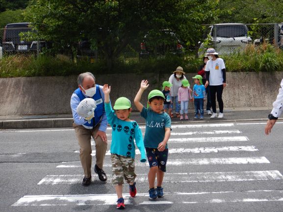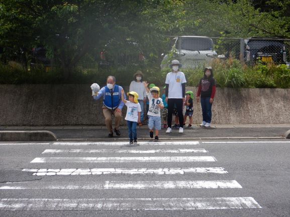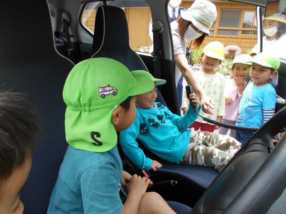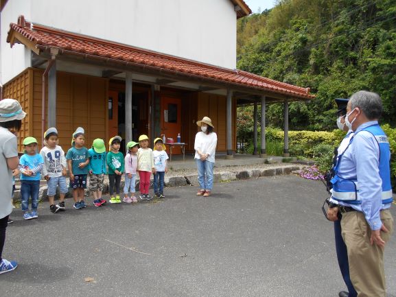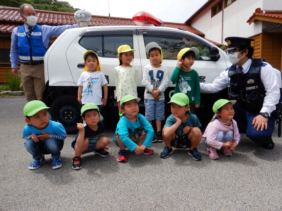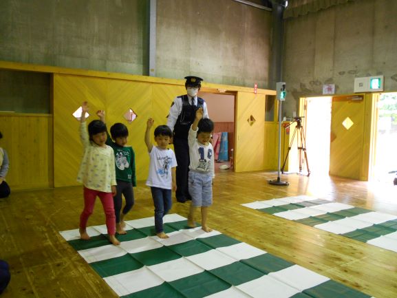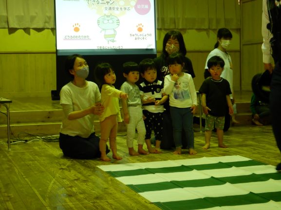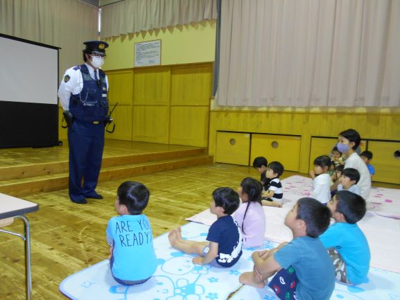 野波駐在所のおまわりさんと、交通安全アドバイザーの方に来て頂いて今年も交通安全教室を行いました。DVDを見て、駐車場での車の乗り降りや、横断歩道の渡り方を分かりやすく教えてもらいました。その中でも、特に『駐車場でのおやくそく』は、子ども達にとって身近なことで、真剣に聞いていました。そして、《車からは1人で降りない》《大人と手をつなぐ》《動いている車に近づかない》の3つの約束をしました。その後、遊戯室で信号機のある横断歩道の渡り方、ない横断歩道の渡り方を練習してから、実際に外へ出て横断歩道を渡ってみました。次々と車が通り、戸惑う子もいましたが、おまわりさんに優しくリードしてもらい「みぎみて、ひだりみて、もういちどみぎをみて」と確認をして渡ることができました。交通安全アドバイザーの方に言われた「命は一つしかないもの、その大切な命を守るために交通ルールを守ろうね」という言葉を子どもだけでなく、私達大人もしっかりと胸に刻んで生活をしていかなければいけないなと思いました。
