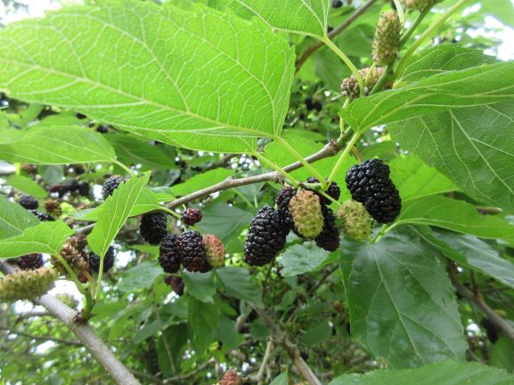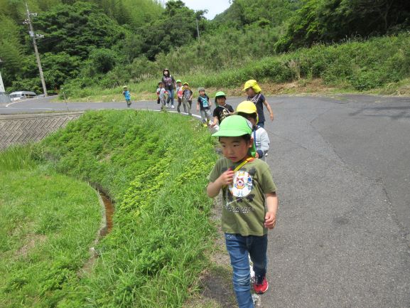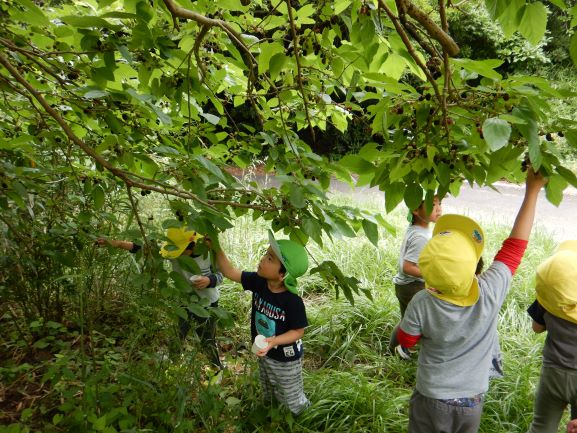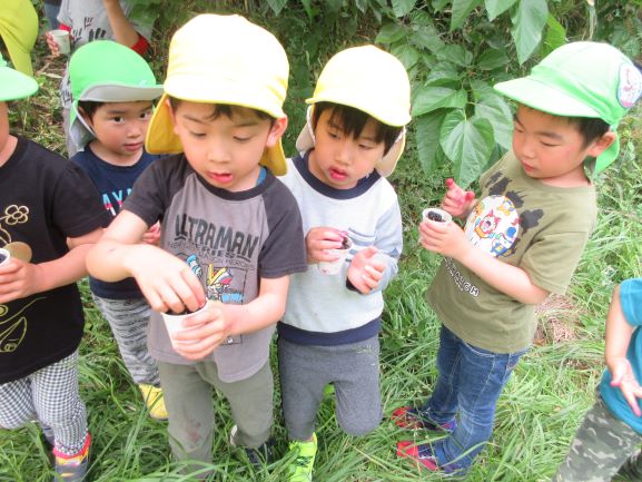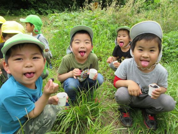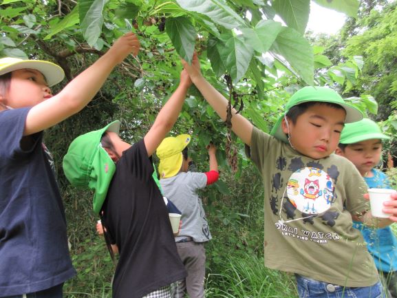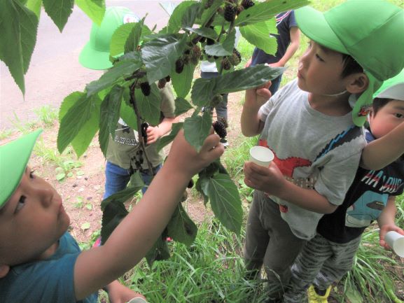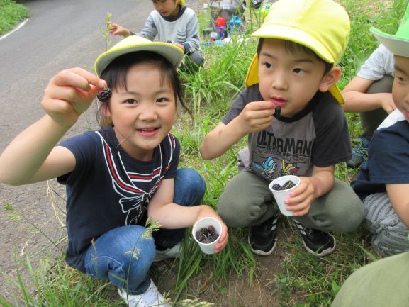 桑の実を採りに散歩に出かけました。「いっぱいあるかなぁ?」「早く食べたいねぇ」と言いながら、楽しみに向いました。到着すると、たくさんの桑の実が実っていました。「わぁー!いっぱいある!」「桑の実狩りだぁ!」「おっきいねぇ」と言って、大喜びで採っていましたよ。そして、「あまぁーい」「おいしい!」と、嬉しそうに食べていました。たくさん食べることができ、大満足の子ども達でした。