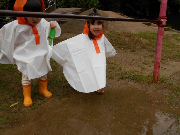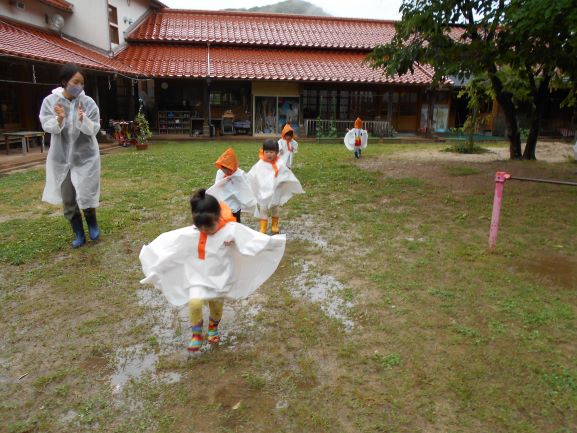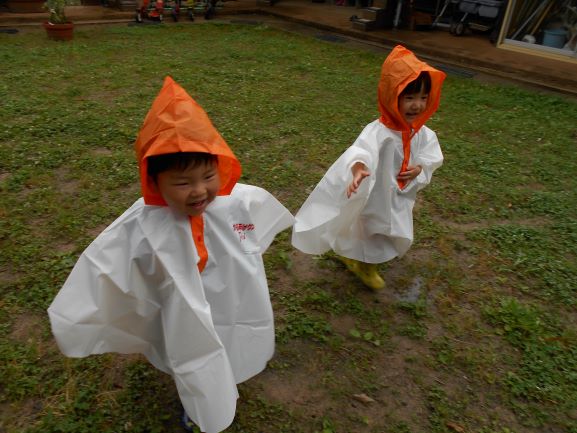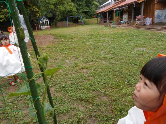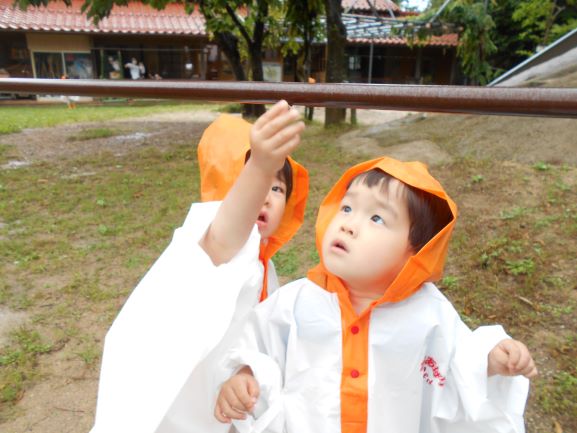 所庭に出ると水たまりの中をそっと覗いてみる子、バシャバシャと思い切り踏み鳴らす子、雨に濡れる草花や雨の日ならではの生き物(蛙)などをじっと観察する子など普段と違った雰囲気を楽しんでいましたよ。