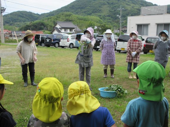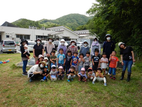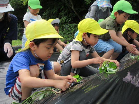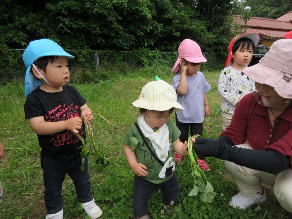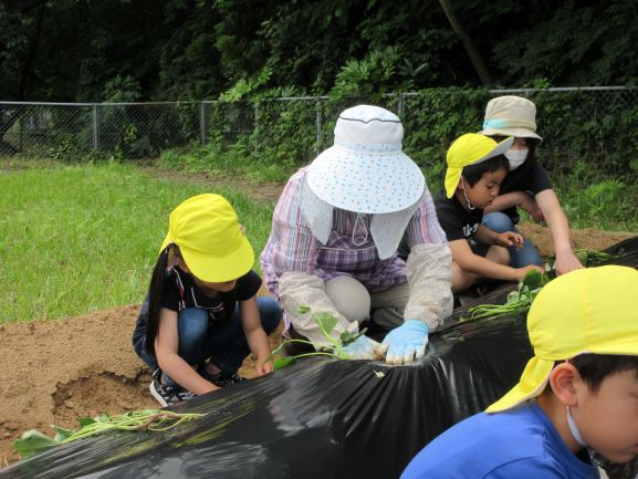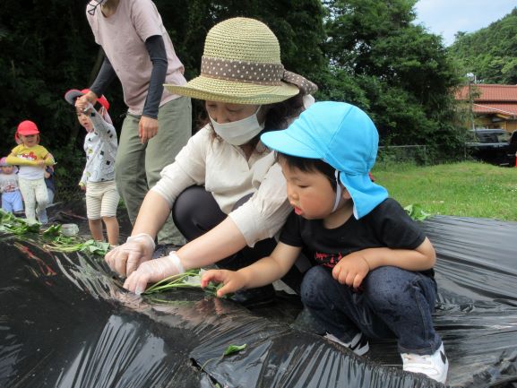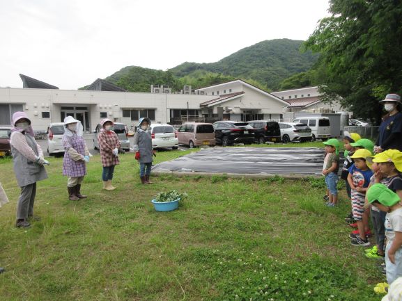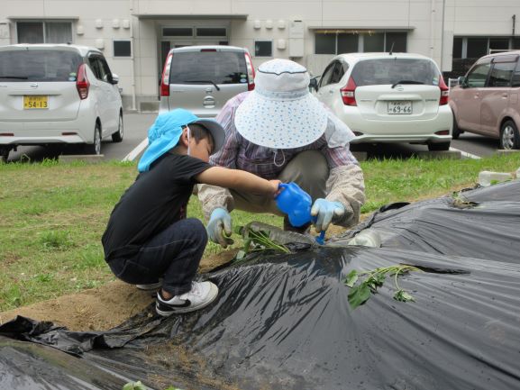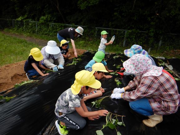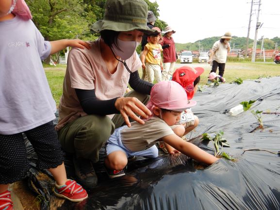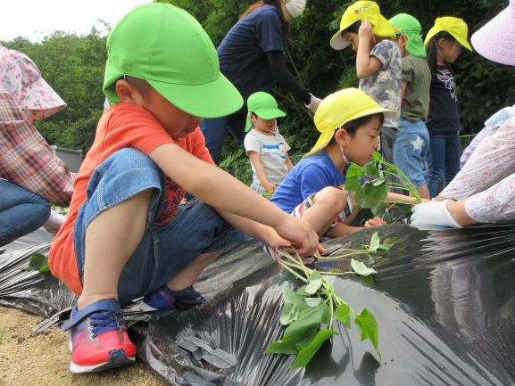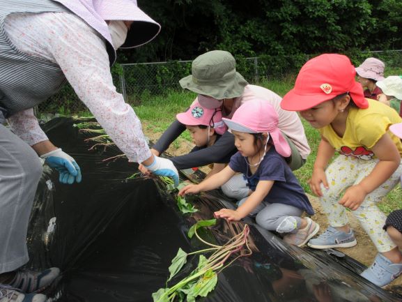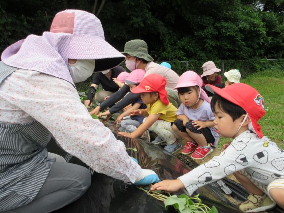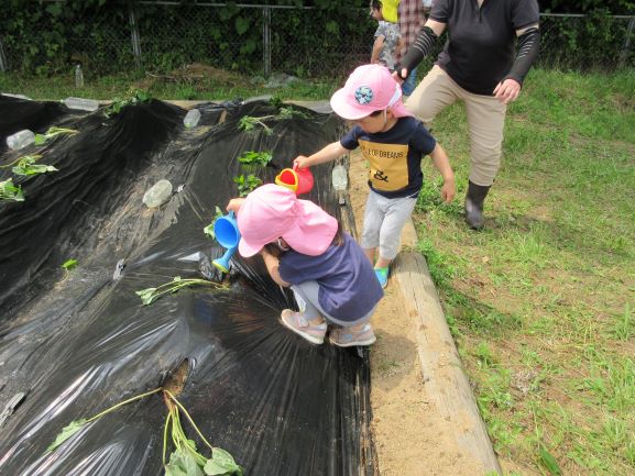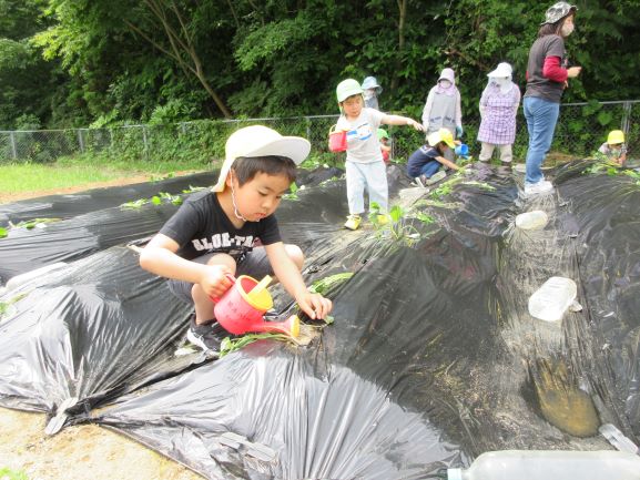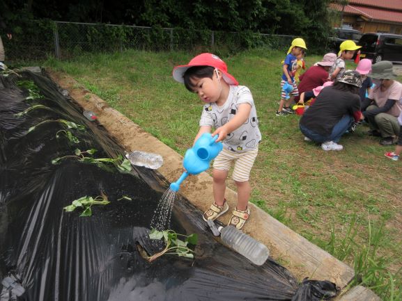 地域講師のおばちゃん達に教えてもらいながら、全クラスでさつま芋の苗植えをしました。丁寧に穴を掘り、優しく土のお布団をかけてあげていました。そして、たっぷりと水やりをしました。元気にすくすく育ち、甘いさつま芋がたくさんできることを楽しみにしている子ども達です。