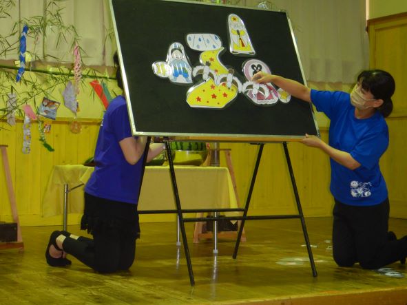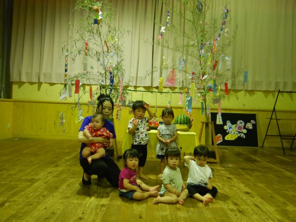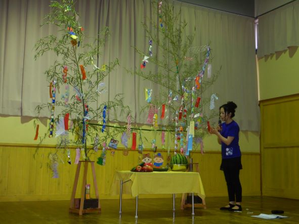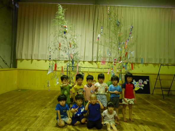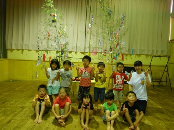 七夕会をしました。地域講師の福島達さんに笹を用意してもらい、短冊や飾りをつけました。 七夕会では由来についてパネルシアターを見たり、歌を歌ったりみんなの願い事を紹介したりして楽しみました。