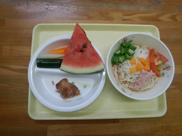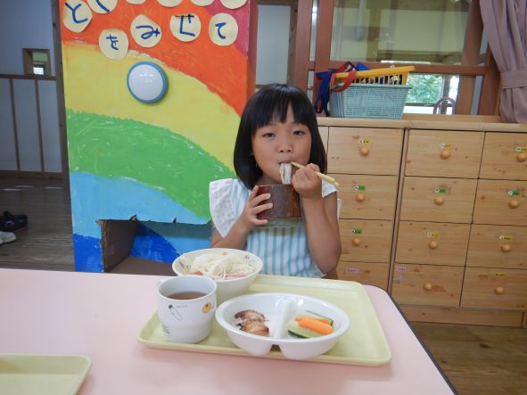 給食は星型に切った人参やオクラの入ったそうめんでした。 年長児は達さんに教わって作った竹の器にそうめんのつゆを入れて食べました。