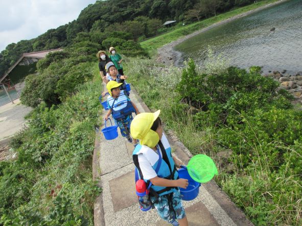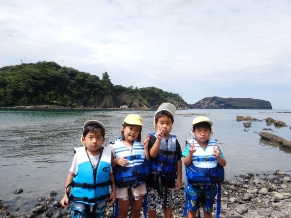 5歳児交流で、マリン保育所と一緒に桂島に磯遊びに行きました。マリン保育所の友達と会えることも、磯遊びができることもとても楽しみにしていました。