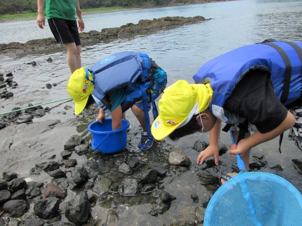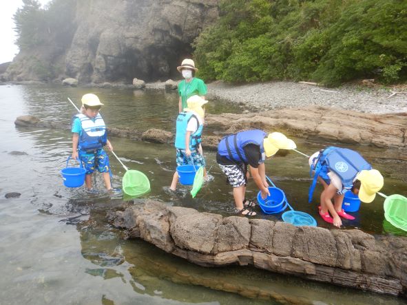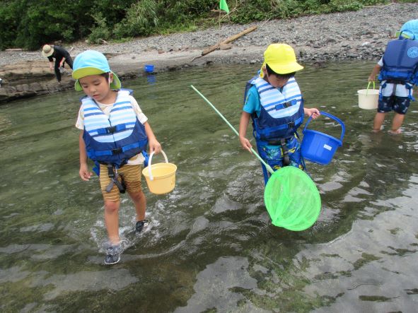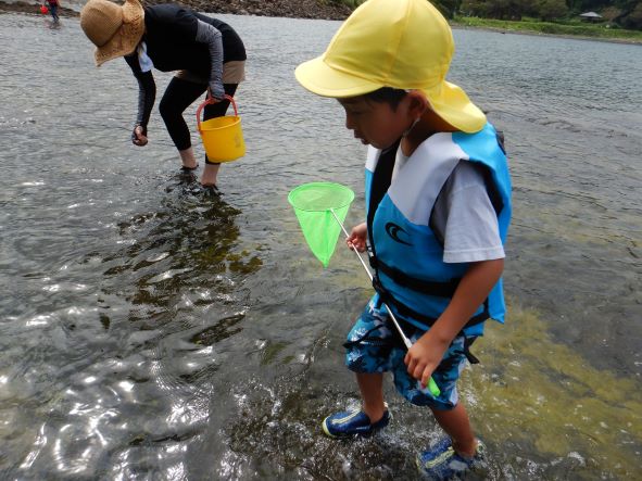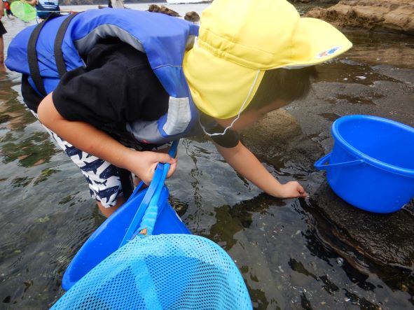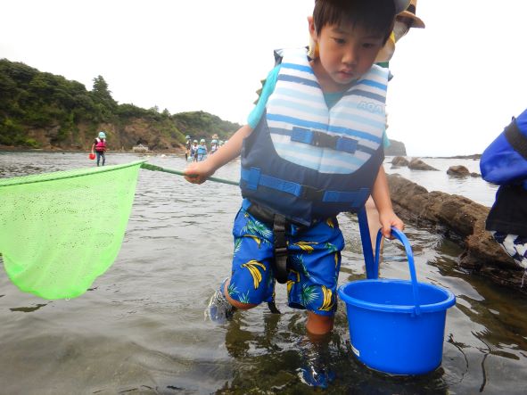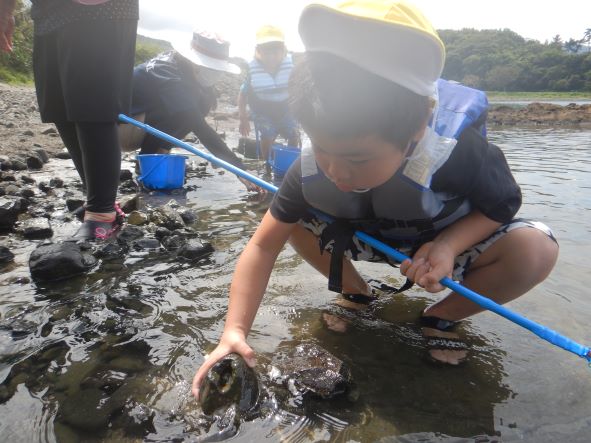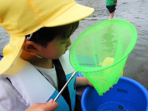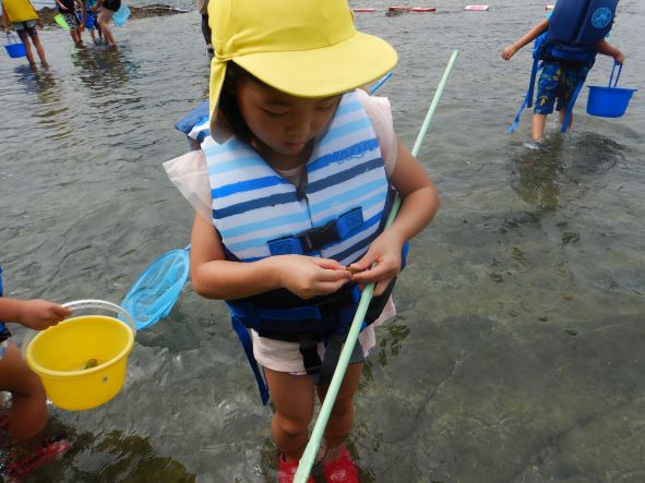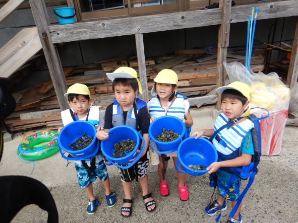 桂島に着くと大喜びで、タモを持って魚やエビ、カニを探したり、貝採りをしたりして楽しみました。「貝いっぱい採ったよ」「カニ9匹も捕まえた!」と嬉しそうに友達や保育者に見せたりしていました。楽しくてあっという間に時間が過ぎました。「楽しかったー」「また来たいね」と満足そうな子ども達でした。