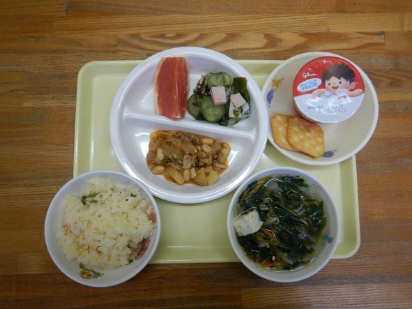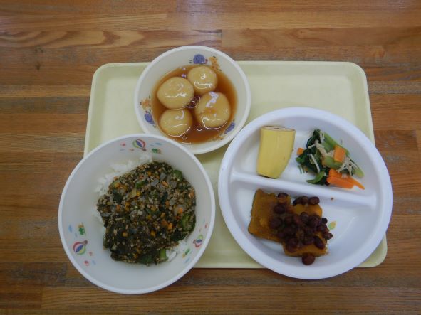 27日の給食は、花嫁寿司でした。花嫁寿司とは、野波地区に伝わる伝統寿司です。お嫁に行く花嫁さんを見送る人々に良縁のおすそ分けとして振る舞ったのが始まりだと言われているそうです。