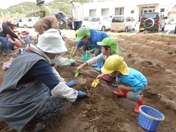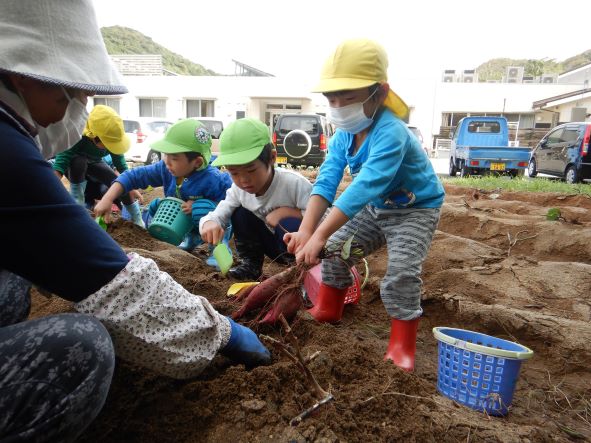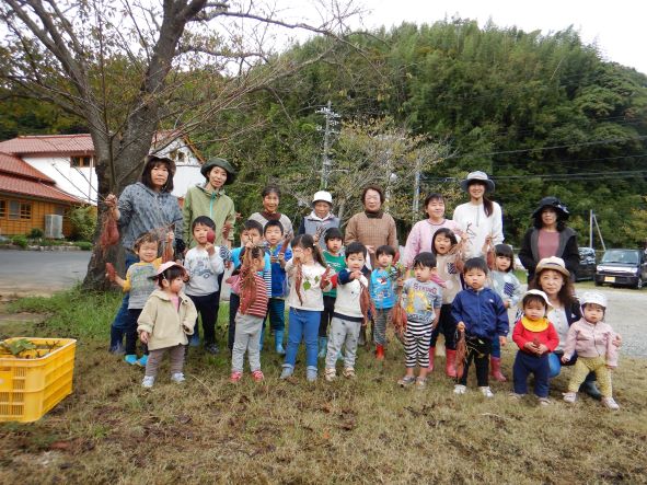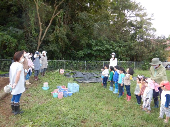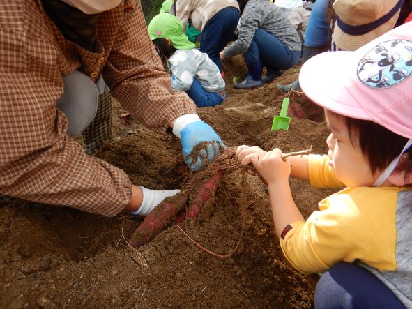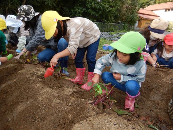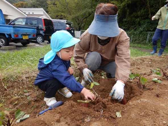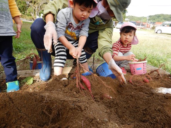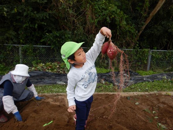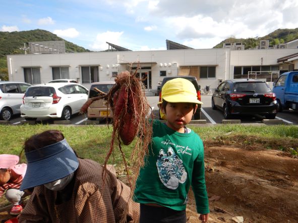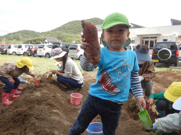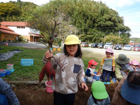 芋ほりをしました。悪天候で一日延期となりましたが、爽やかな秋晴れの空の下、地域講師さんと一緒に、楽しく賑やかに行うことができました。次々と出てくるたくさんの芋に、みんなが大喜びでした。