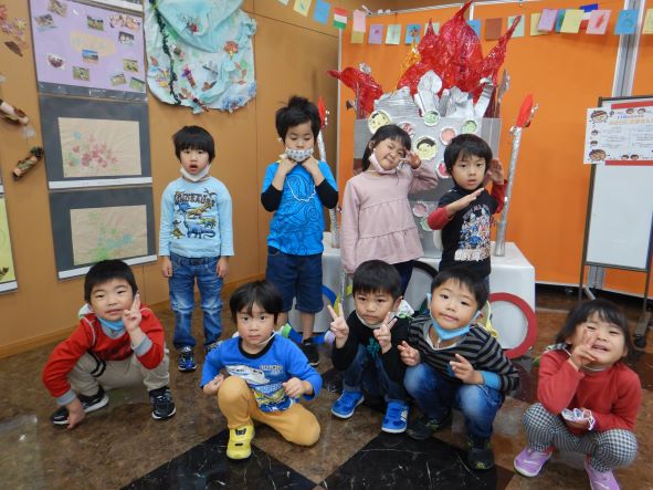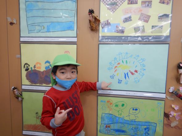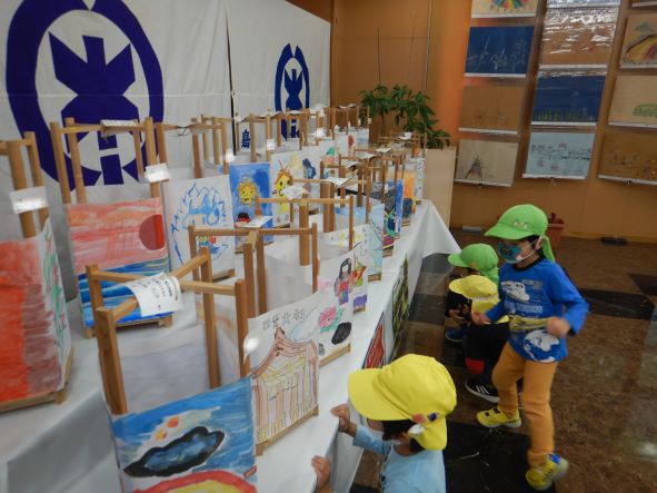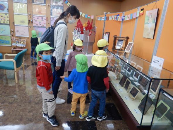 公民館に文化祭の展示を見に行きました。自分の描いた絵や作った作品を見つけて、「ぼくのあったー!」「みてみて!見つけたよ」と言いながら、嬉しそうに眺めていました。その他にも、マリン保育所や小学校のお兄さんお姉さんの作品などもあり、「あっ、○○ちゃんのだ!」「すごいねぇ」などと言いながら、じっくりと見ていました。