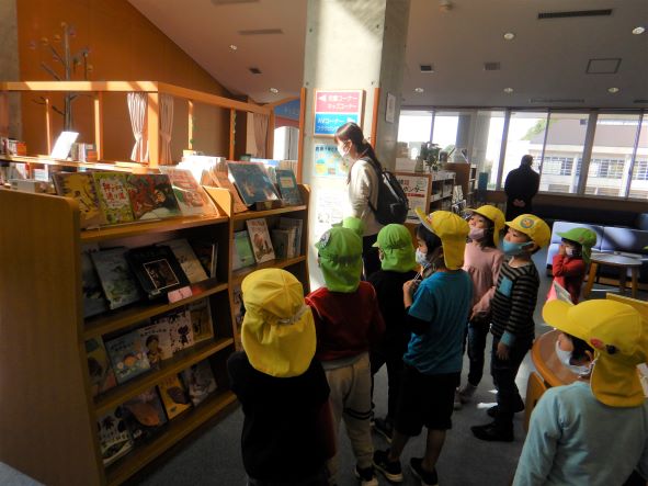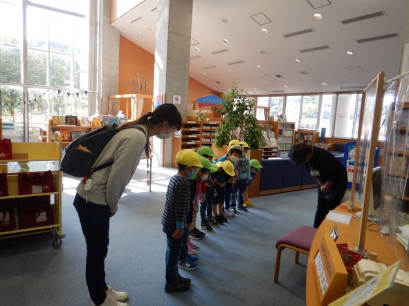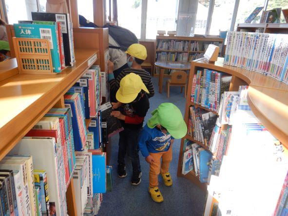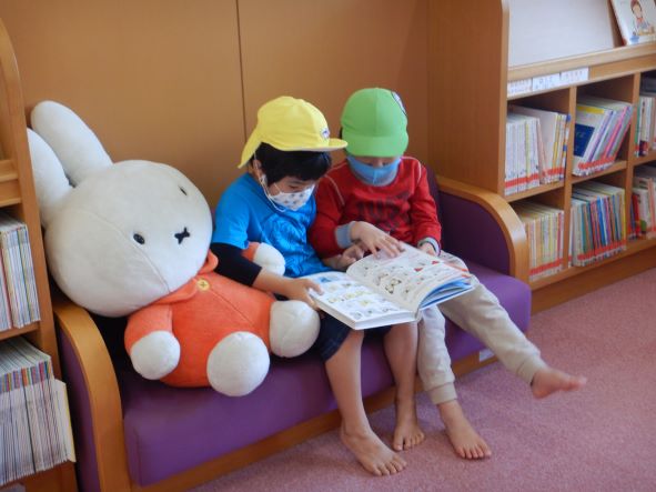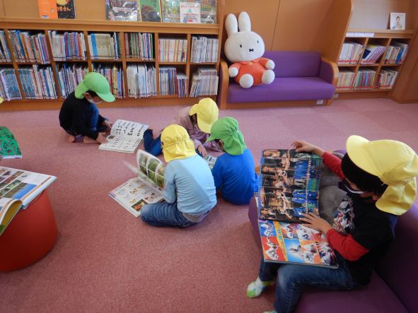その後は、図書館に絵本を借りに行きました。たくさんの絵本の中から選べることをとても喜んでいましたよ。そして、バスの時間まで少し時間があったので、読みたい絵本を選んで読みました。1人でじっくり見たり、友達と一緒に楽しんだりしていました。