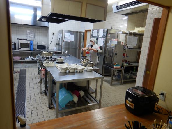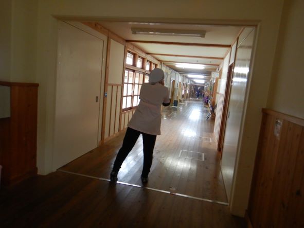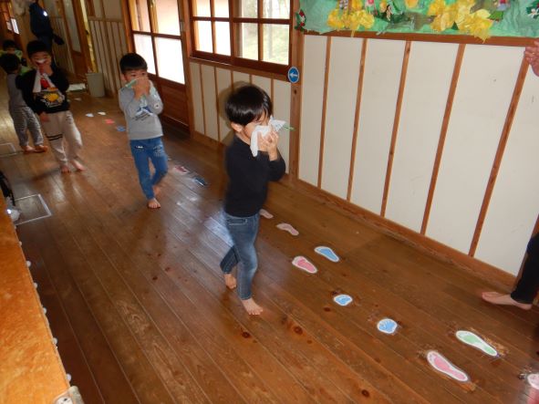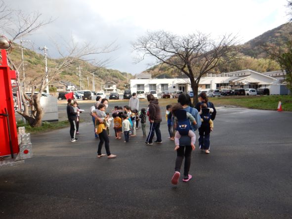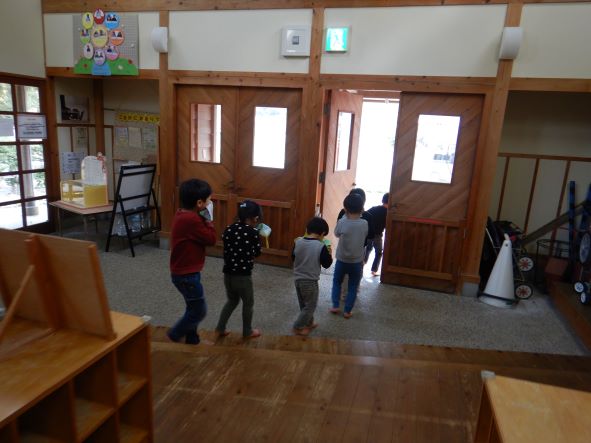 出火元の給食室から「火事だ~」の知らせを受け、煙を吸わないように口元を覆いながら 避難場所へ。