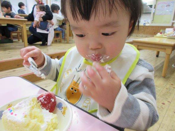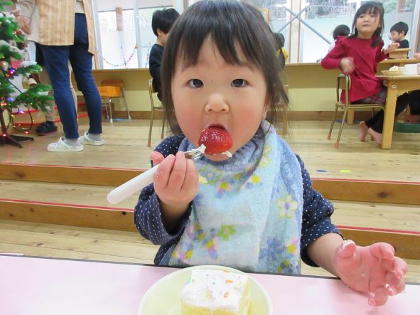 おやつにクリスマスケーキを食べました大きいイチゴ「ぱくり」