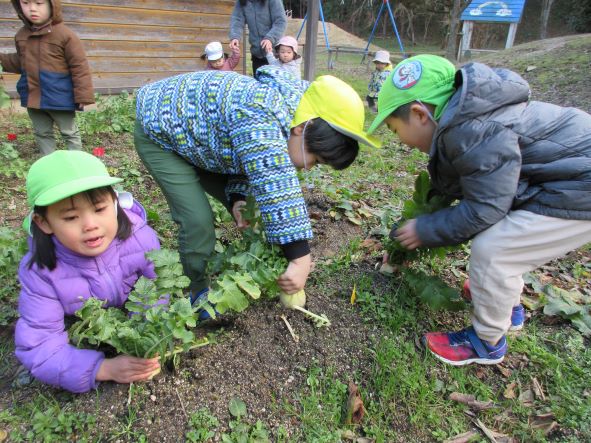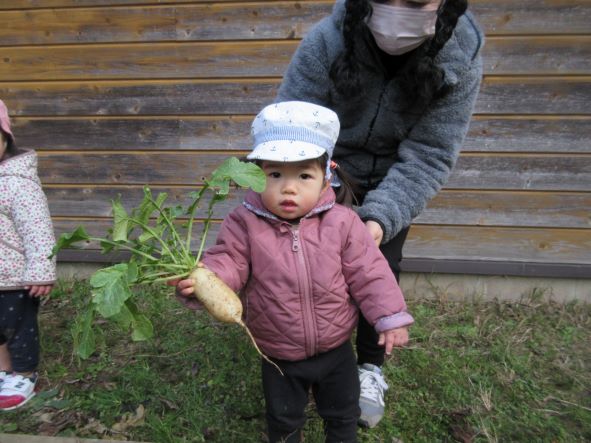 保育所で育てたおでん大根が大きくなったので、みんなで収穫しました。