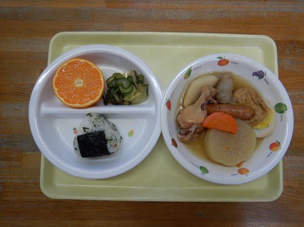 おでん給食です。おにぎりには、大根の葉を混ぜました。