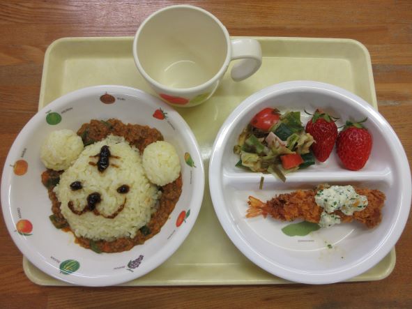 給食は、寅年にちなんだ虎イ(ドライ)カレーにエビフライ、元気サラダ、イチゴでした。食べるのがもったいないくらいかわいいトラさんに子ども達は大喜びでした。