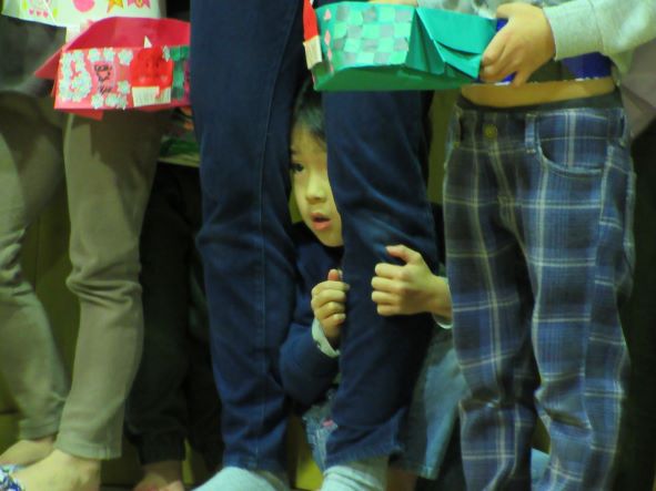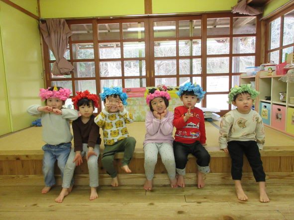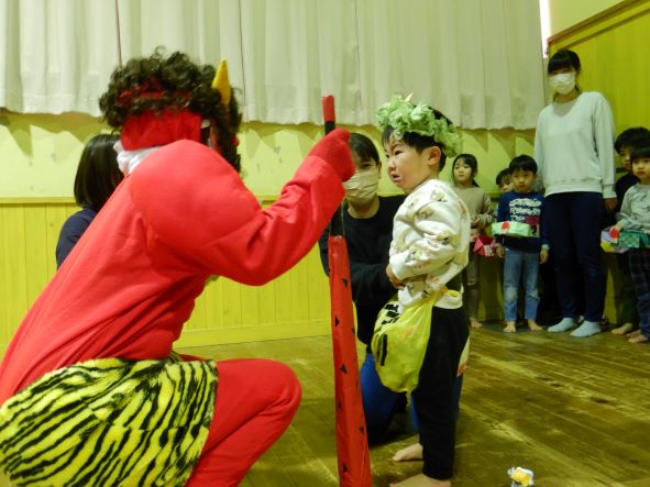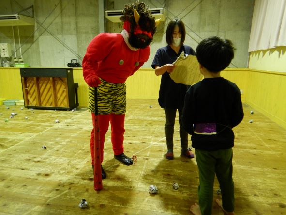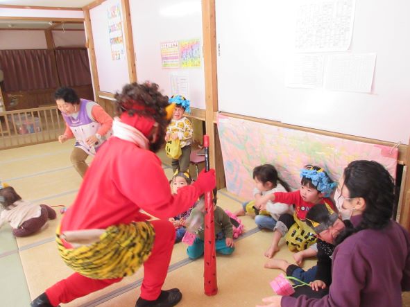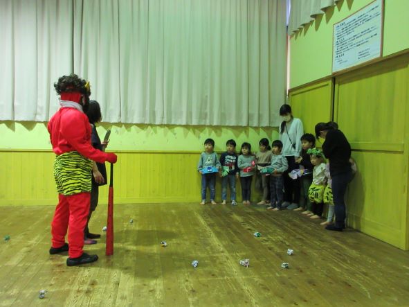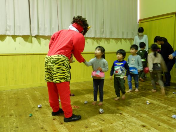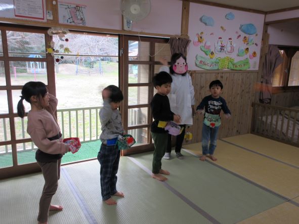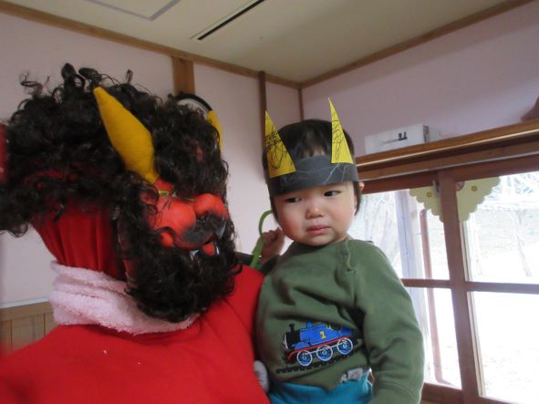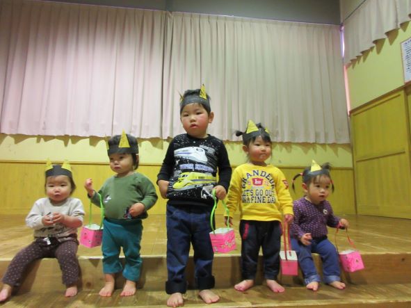 今日は節分ということで、豆まき会をしました。昨日までは張り切って、豆入れや新聞豆を作ったり、「鬼退治しようね」と言ったりしていた子ども達でしたが、今日は朝からなんだかそわそわしていました。