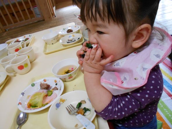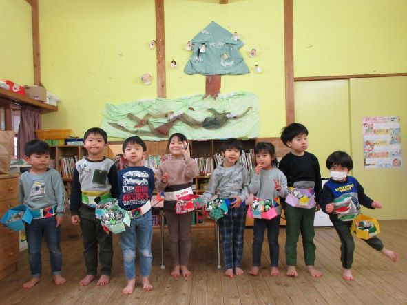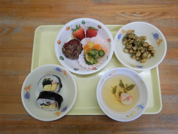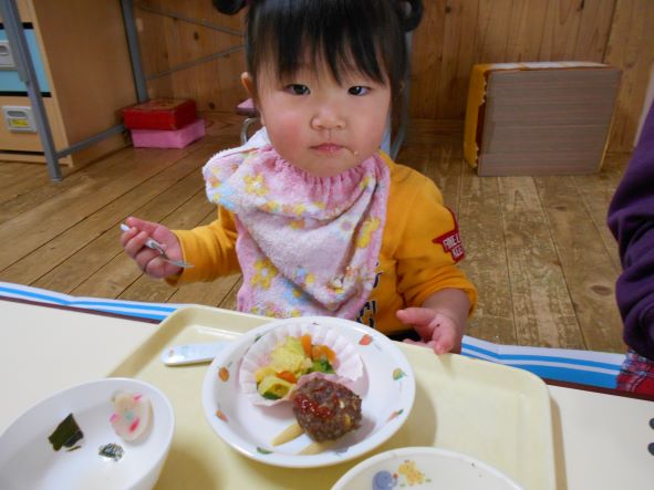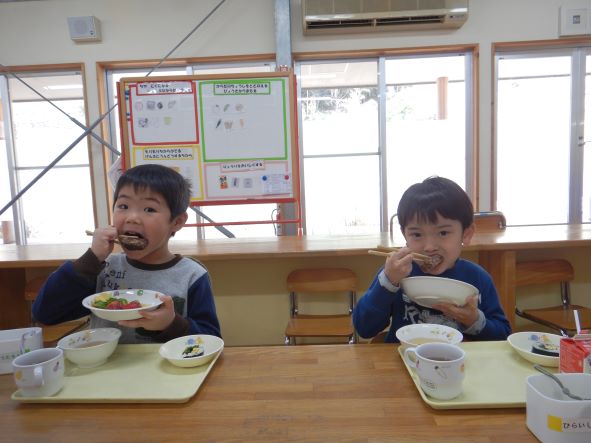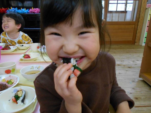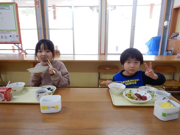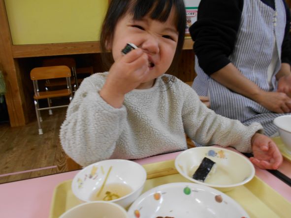 鬼が帰った後、ホッとしてお腹がすき、節分メニューの給食を嬉しそうに食べていました。恵方巻を食べる時には、「おしゃべりせずに食べるんだがぁ」と言って、静かに食べていました。