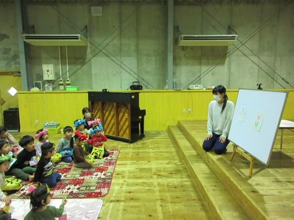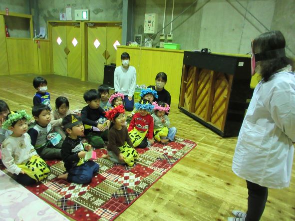 遊戯室で節分の由来のパネルシアターを見たり、『豆まき』の歌を歌ったりしました。パネルシアターの時には、知っていることを手を挙げて発表したり、笑顔の子もいたりしましたが、会が進むにつれて、少しずつ表情が曇っていき、鬼がもう来るのではないかとドキドキする子ども達でした。
