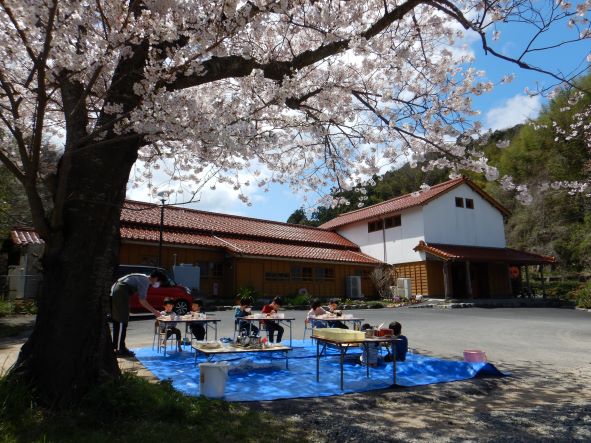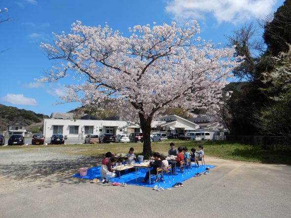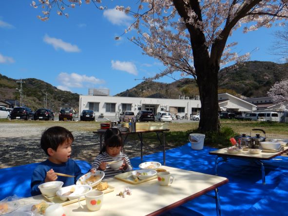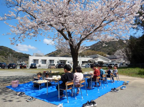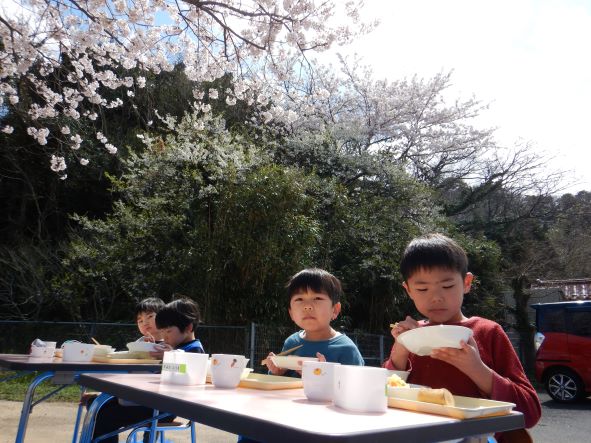 風が吹くと、ひらひら舞った桜の花びらが机の上にぽとんと落ちて、「きれいだね。春だね~」と、子どもたちとお花見給食を楽しみました。