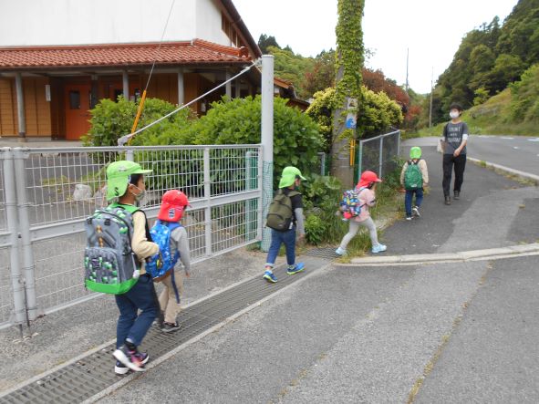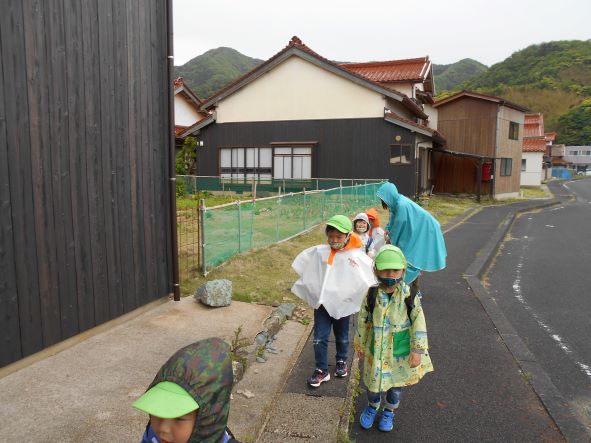 帰り道の途中で小雨が降ってきたので、準備していた雨合羽を着て雨の日の散歩を楽しみました。