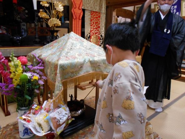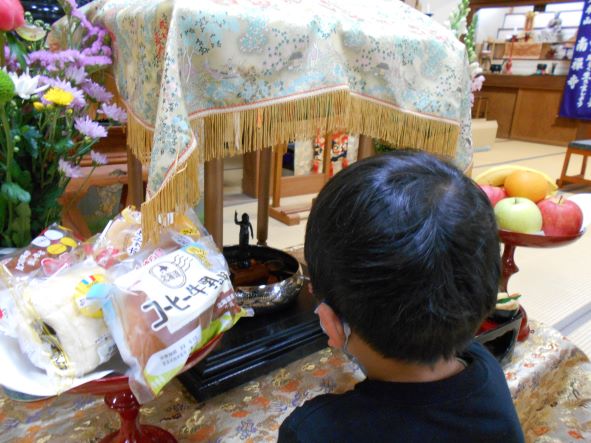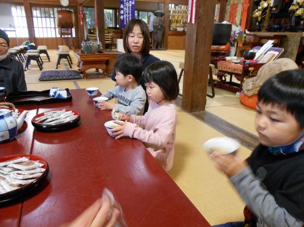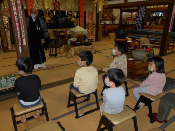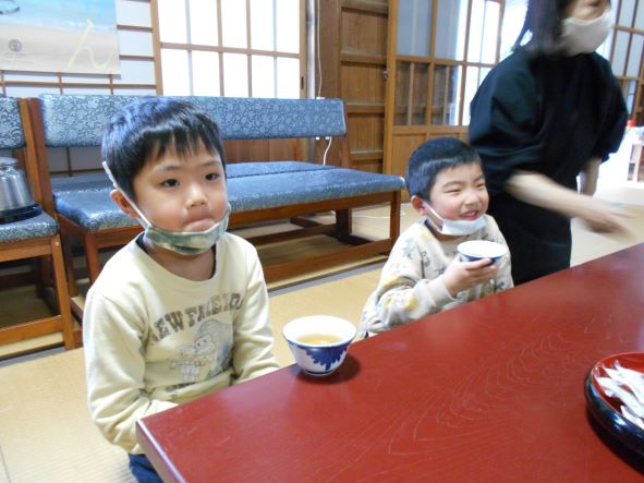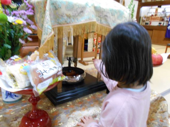 住職さんから、花まつりはお釈迦様がお生まれになった日だということ、その時に空から甘い雨が降ってきたこと、今では甘茶を飲んでお祝いすることなどの話を聞きました。「あまいあめってどんなだろう」「ふしぎだね・・・」と友達同士で顔を見合わせていました。お祈りが終わると、甘茶とおせんべいを頂きました。恐る恐る飲んで〝あれ?おいしい・・・"とお代りをする子もいれば苦笑いをする子もおり、いろいろな表情が見られました。
