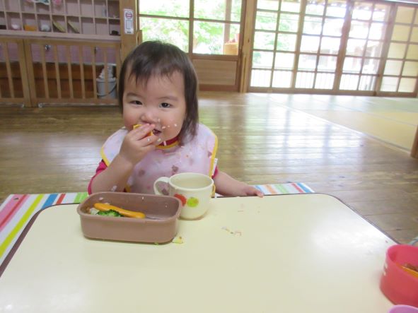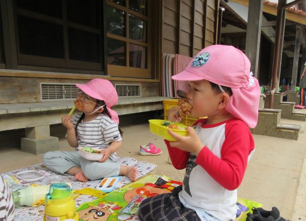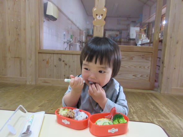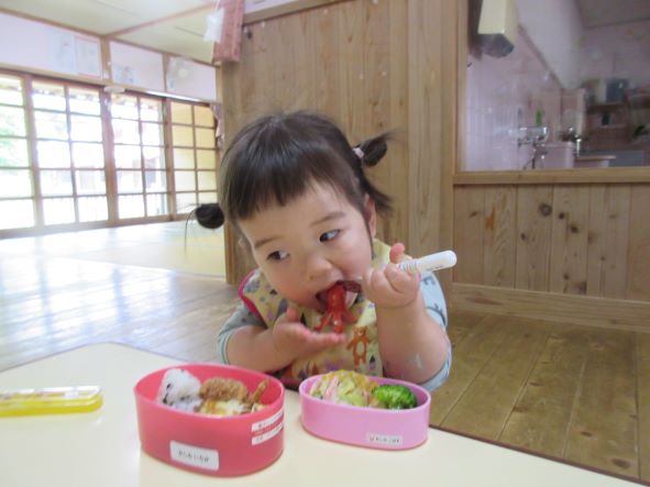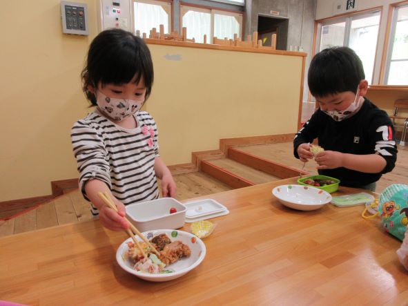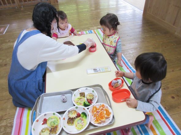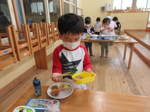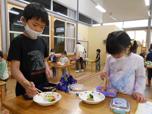 幼児クラスは持ってきたお弁当箱に、給食のおにぎりとおかずを自分たちで詰めました。自分が食べるおにぎりは、ラップで包み握りました。乳児クラスは、担任が詰めました。
