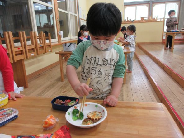 空だったお弁当箱に、どんどんおかずが詰まっていくのを見て、わくわくが止まらない様子でした。おにぎりも、丸や、三角、四角、中には「恐竜だよ」と言って作っている子もいました。