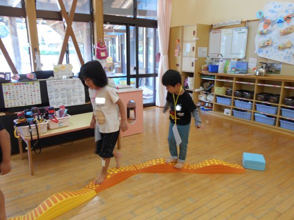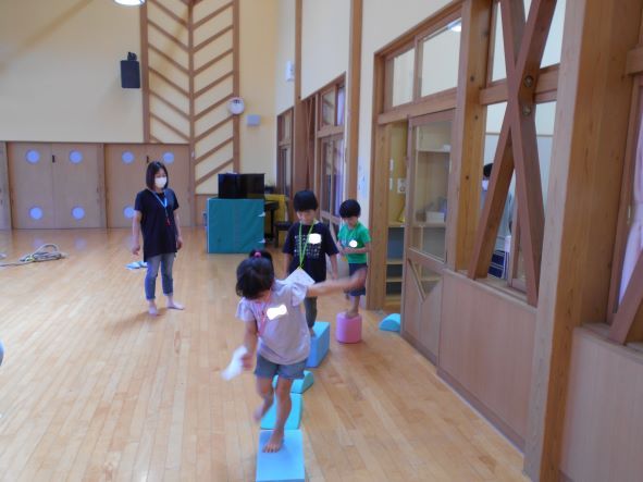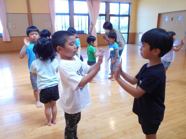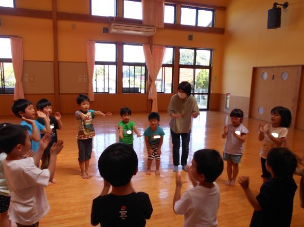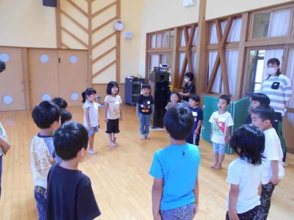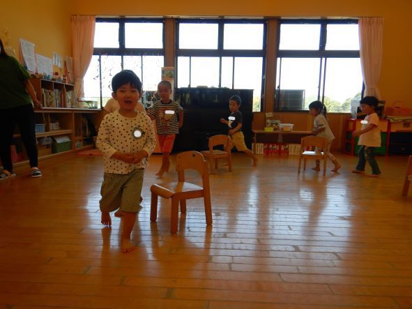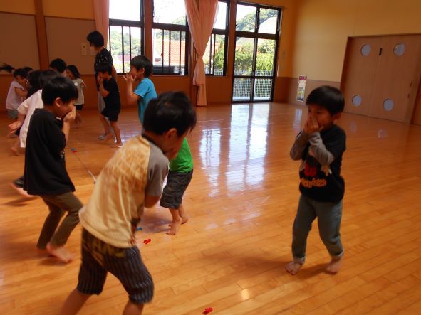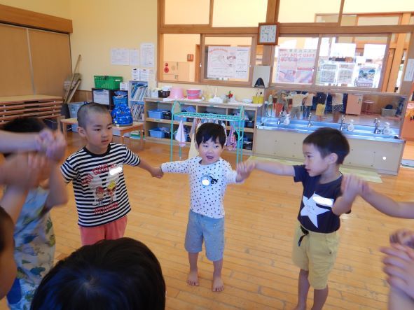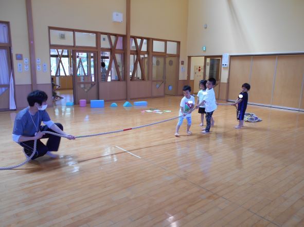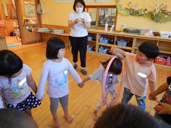 歌を歌ったり、お友達と協力してフープをくぐったりしました。