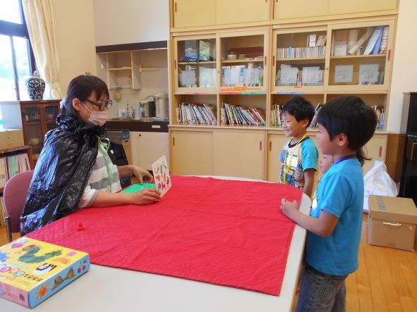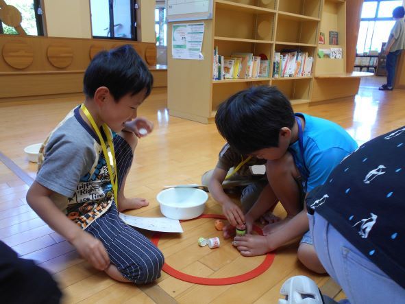 到着すると4、5歳児それぞれのクラスに分かれ、自己紹介やふれあい遊び、ゲームなどを楽しみました。一緒に過ごすうちに徐々に緊張もほぐれ、笑顔で友達と話したり遊んだりする姿がたくさん見られました。