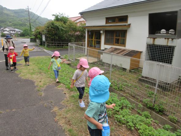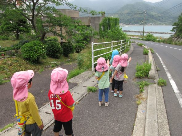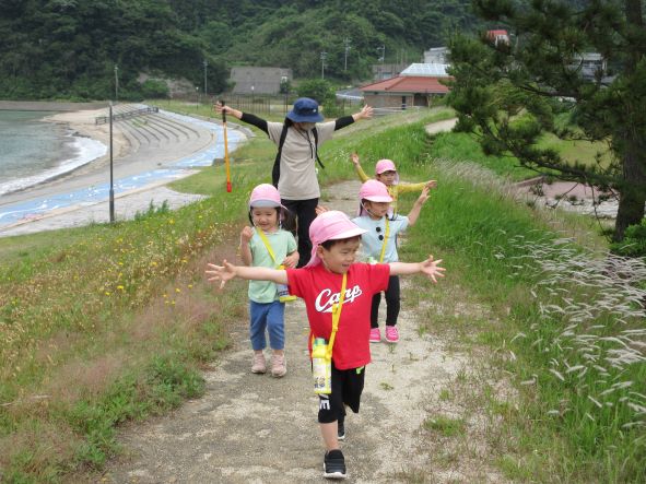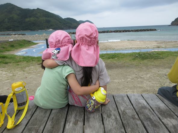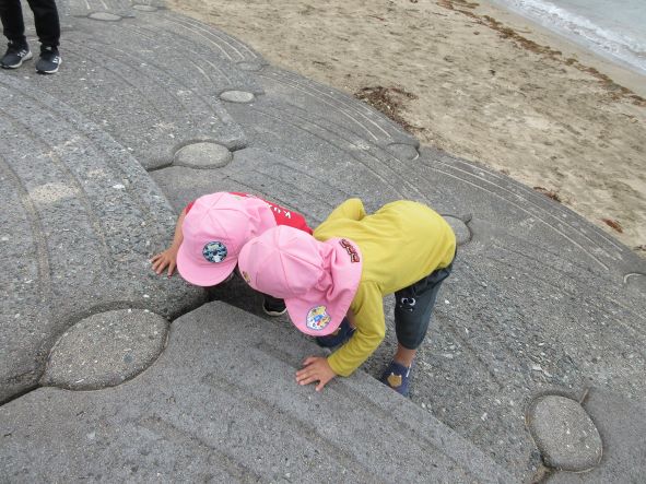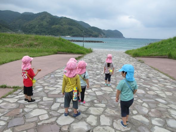 海が見えてくると「わーうみだー」と大喜び。しかし、風が強かったり、海の波しぶきが激しかったりするのを見て、「さむーい」「海が怒ってるね」と感じた事を言葉にして表現する子どもたちでした。