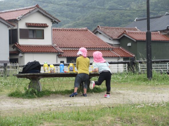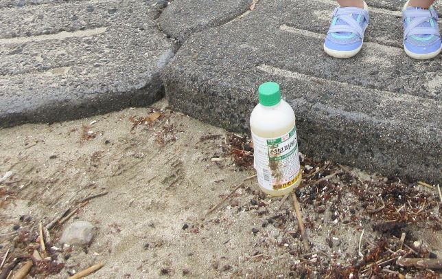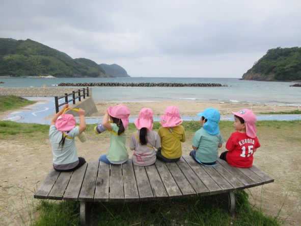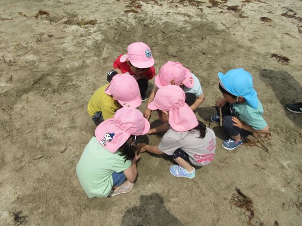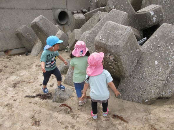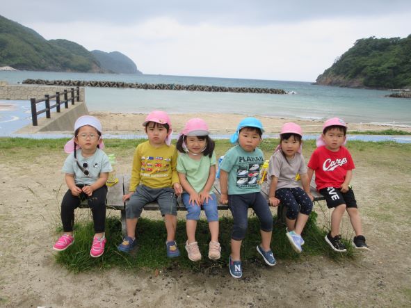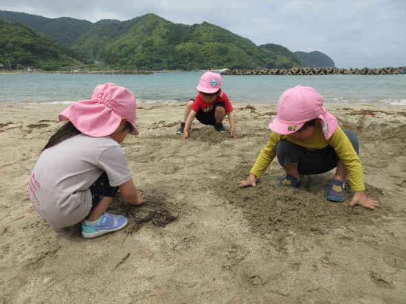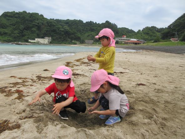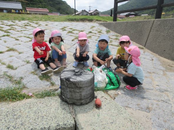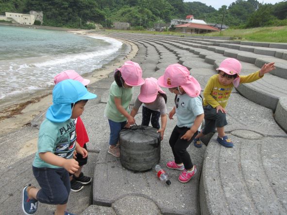 遊んでいると、黒いものが波に揺られて浜にうちあげられました。何だろう?運んでみると、浮きのごみでした。その後もペットボトルを見つけた子どもから「これ おさかなさんがたべたら しんじゃう」と悲しそうな声が聞かれました。そこで、“クリーン大作戦”開始!ごみを見つけて集めました。小さな子どもたちも海の汚れは心配と感じる心を持っています。今度はごみを入れる袋を持って出かけたいと思いました。