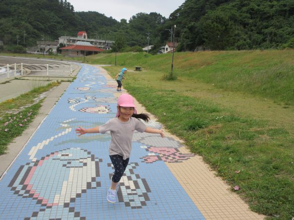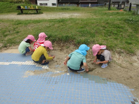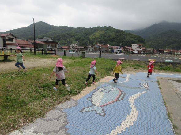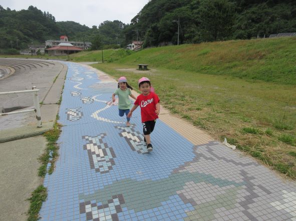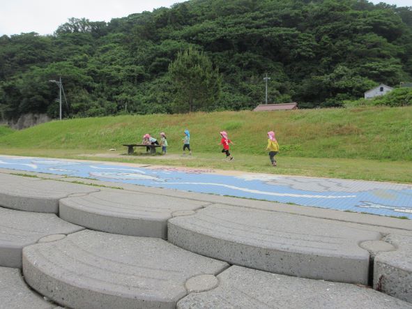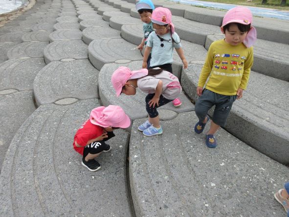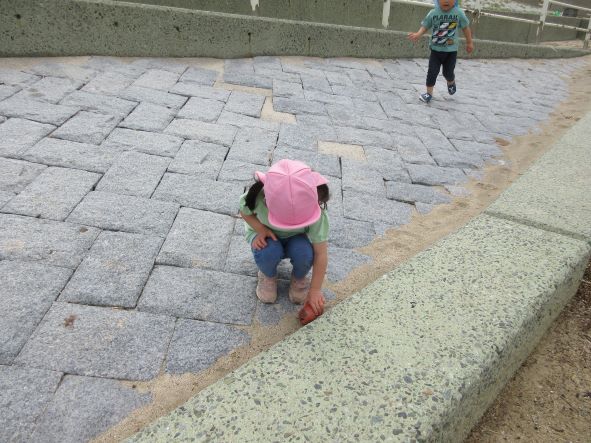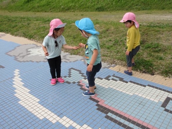 海浜公園では、地面に敷いてある魚のタイルから、問題を出して探したり、追いかけっこをしたり、きれいなお花を摘んだりしました。