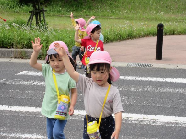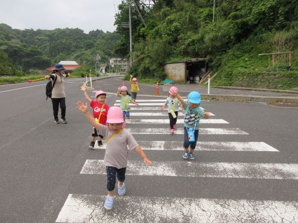 交通安全教室で教えてもらった横断歩道の渡り方を実践