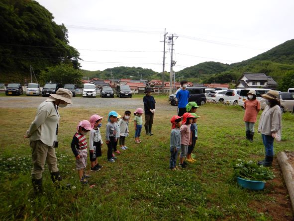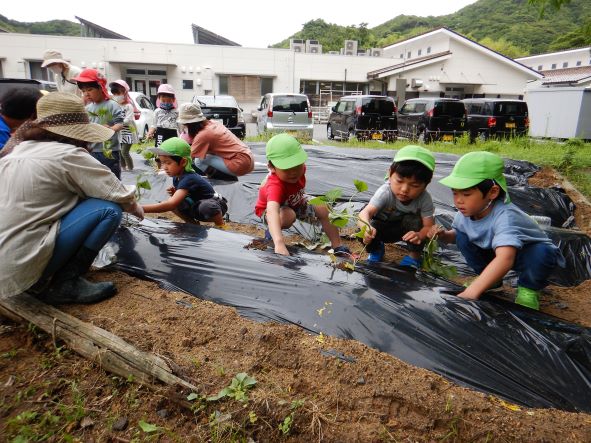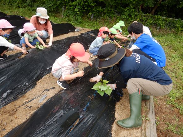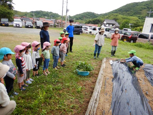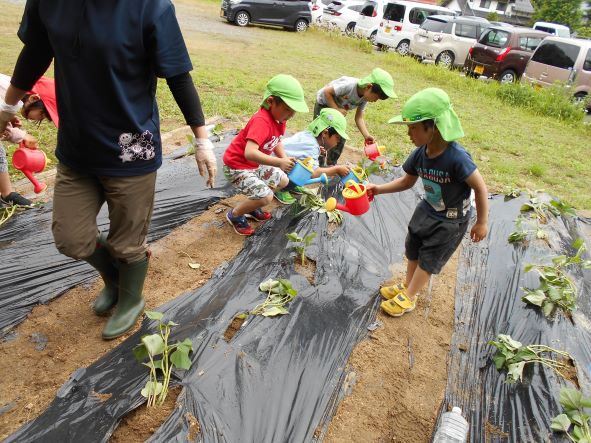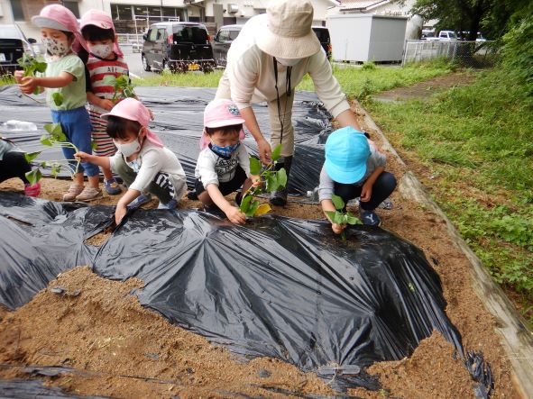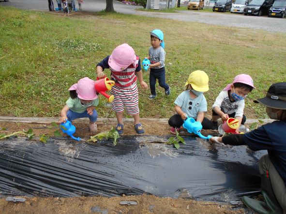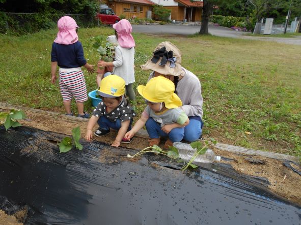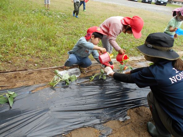 〝土を掘って深くに植える"〝優しく土の布団をかける"ことをしっかりと聞き、80本の苗を植えました。植え終わった後はたっぷりと水やりをし、「はやくおおきくならないかなぁ」「やきいもにしてたべたいなぁ」「シチューにいれるのもいいね」と話し、大きく生長し、皆で食べるのを楽しみにする子どもたちでした。