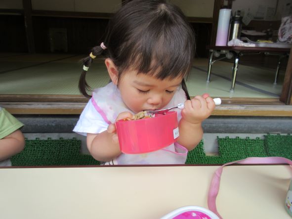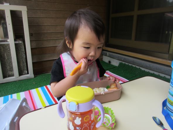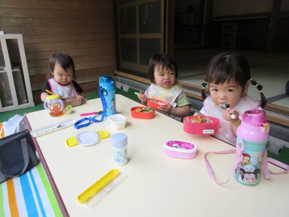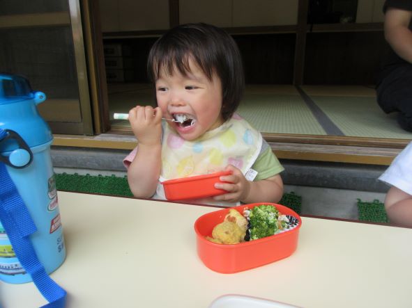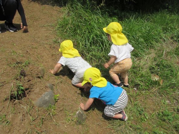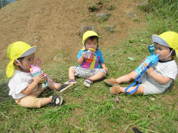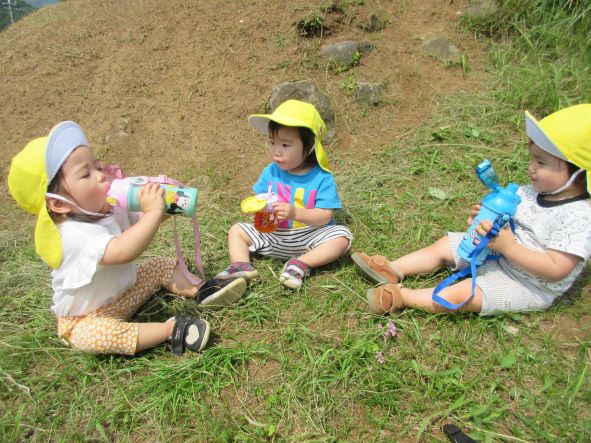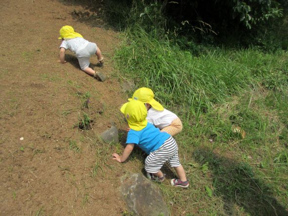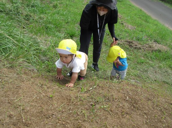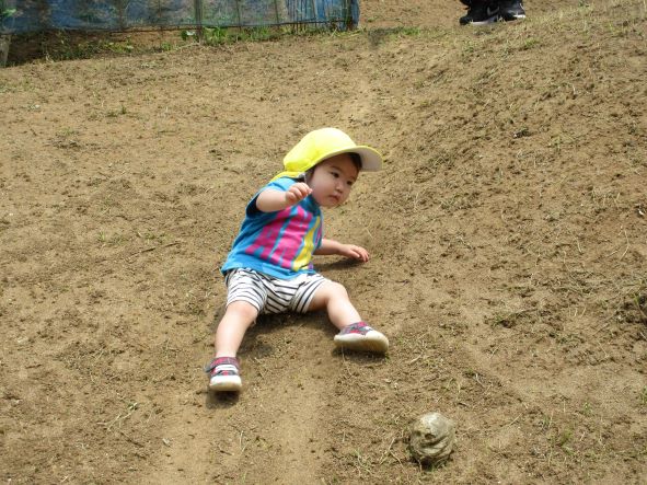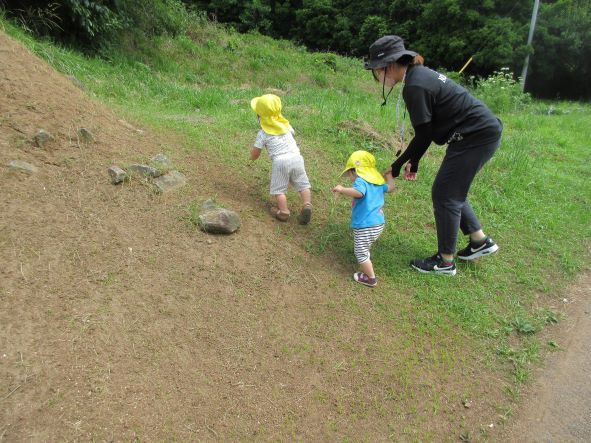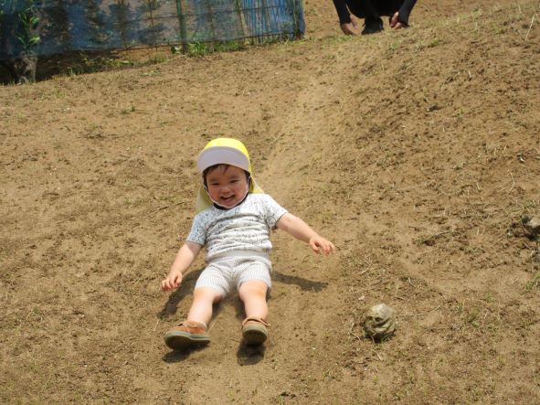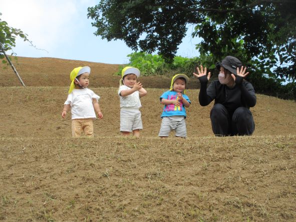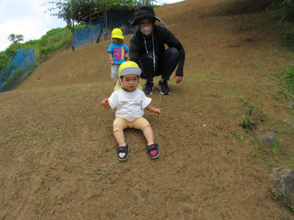 初めてコロコロ斜面にお散歩行きました。コロコロ斜面に着くときれいに刈ってあり、遊びやすくなっていました。子ども達が遊びやすいようにいつもきれいにして下さっている川岡さんに感謝をしながら、遊ばせてもらいました。小さい体で一生懸命登っている姿がとっても可愛らしかったです。保育所に帰っでお家の人が作ったお弁当を美味しそうに食べていましたよ。
