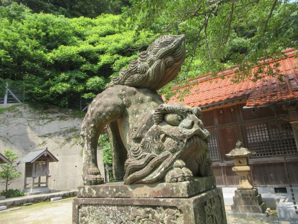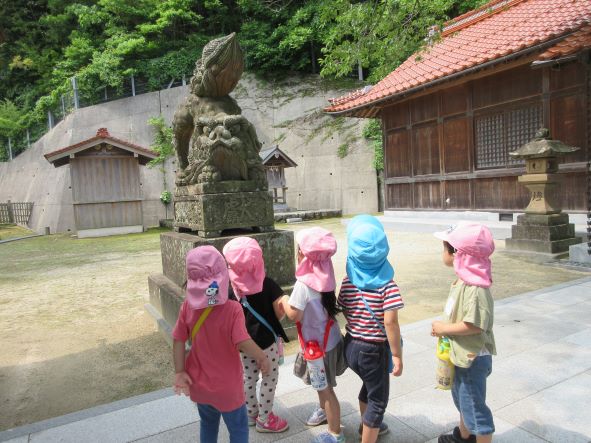 狛犬を観察「くちを んってしてる」「こっちはあーんしてる」「べろが こうなってる」と顔真似