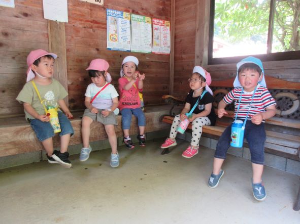 「ここすずしそう。 ちょっときゅうけいしていこー」保育所の前のバス停で休憩