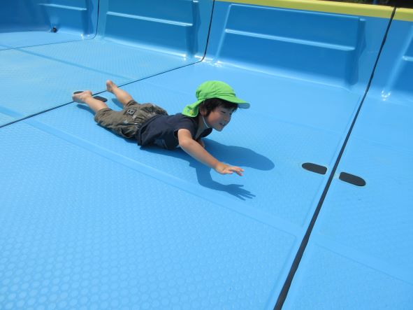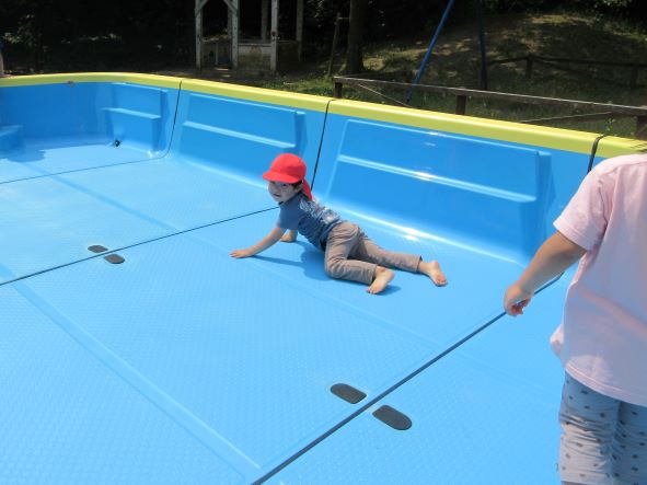 残念ながらまだプール遊びはできませんが、空のプールに入ってプール遊びの気分を味わいました。