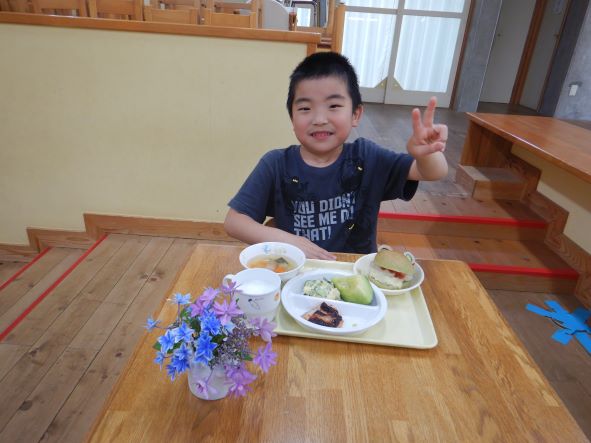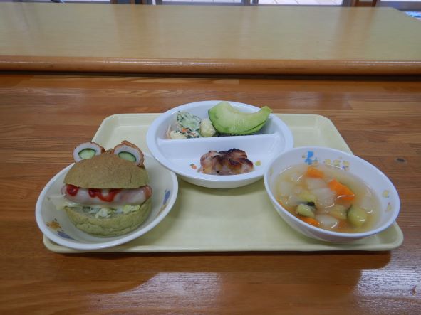 給食は、可愛らしいホットケロドックで、「あっかえるさんだ!」「かわいい」「おいしそう」と言いながら、大きな口で頬張っていました。