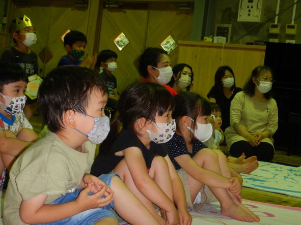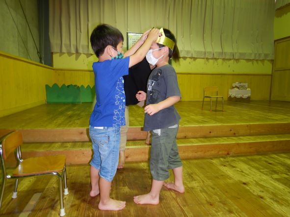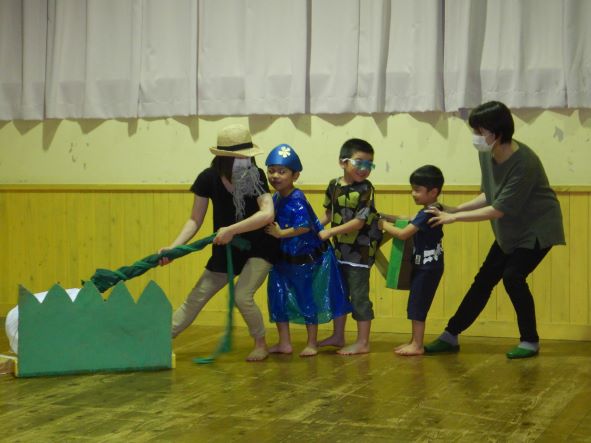 今日の主役は、年長児1名でした。みんなからは「おめでとう」の言葉や歌、お母さんからは温かいメッセージのプレゼントがあり、終始ニコニコ笑顔の誕生児さんでした。お楽しみ会はエプロンシアター『どろんこねこちゃん』と劇『おおきなかぶ』でした。エプロンシアターは、小さな子も興味津々で見入っていました。劇は、年長児が自分たちで工夫しながら作った衣装を着けて参加してくれて、とても盛り上がりました。