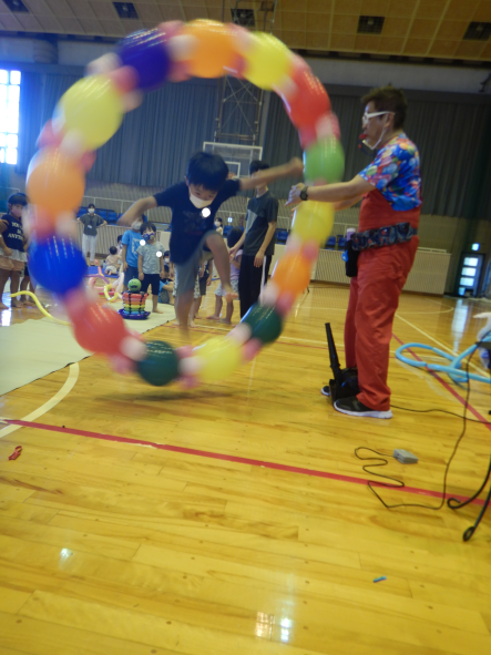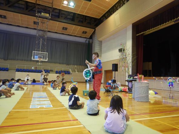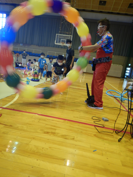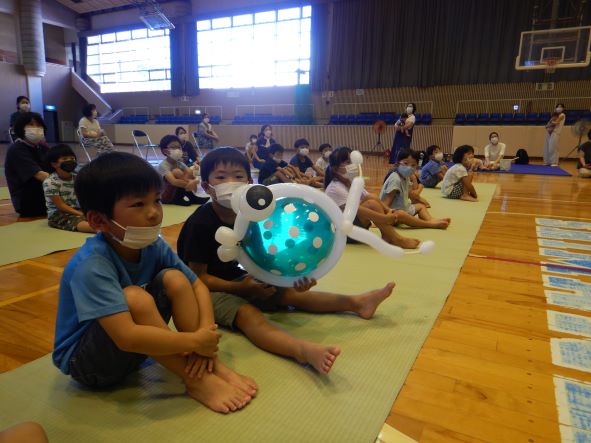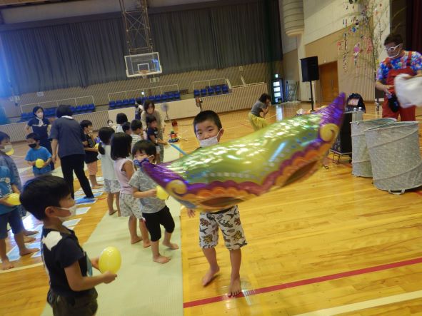 お土産にバルーンの動物や、公民館の方たちが折り紙を折って作って下さった手裏剣やブンブンごまをもらい、嬉しそうでした。
